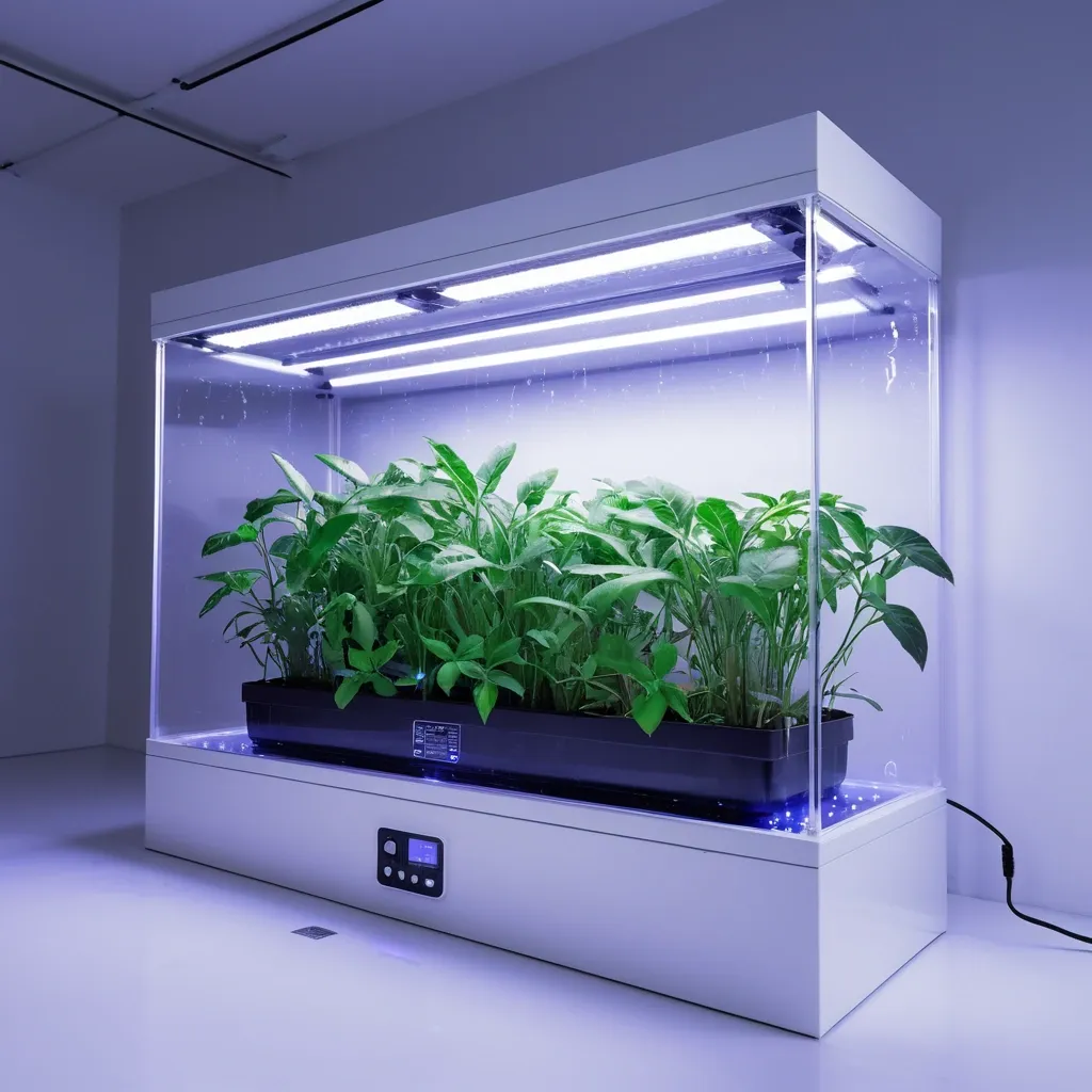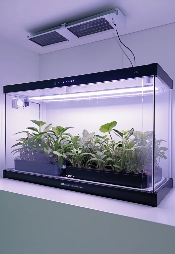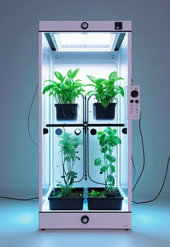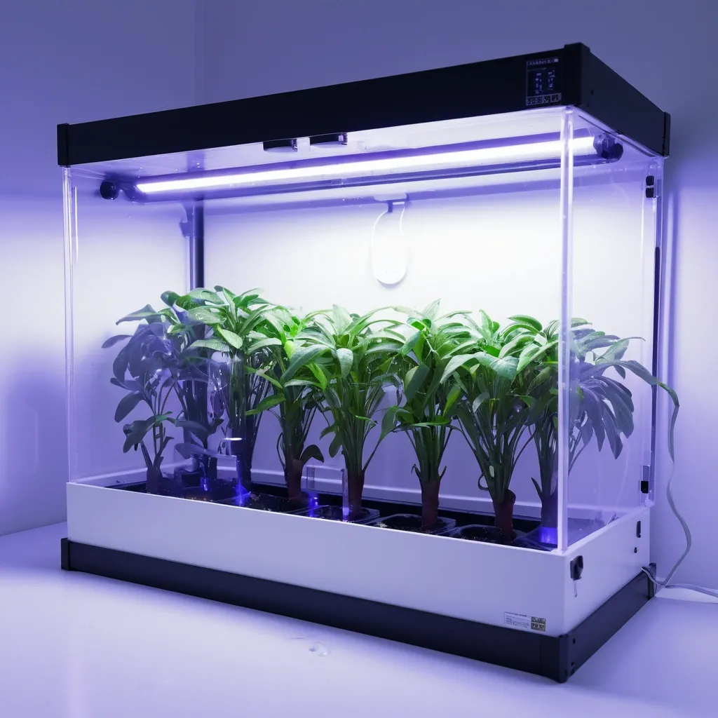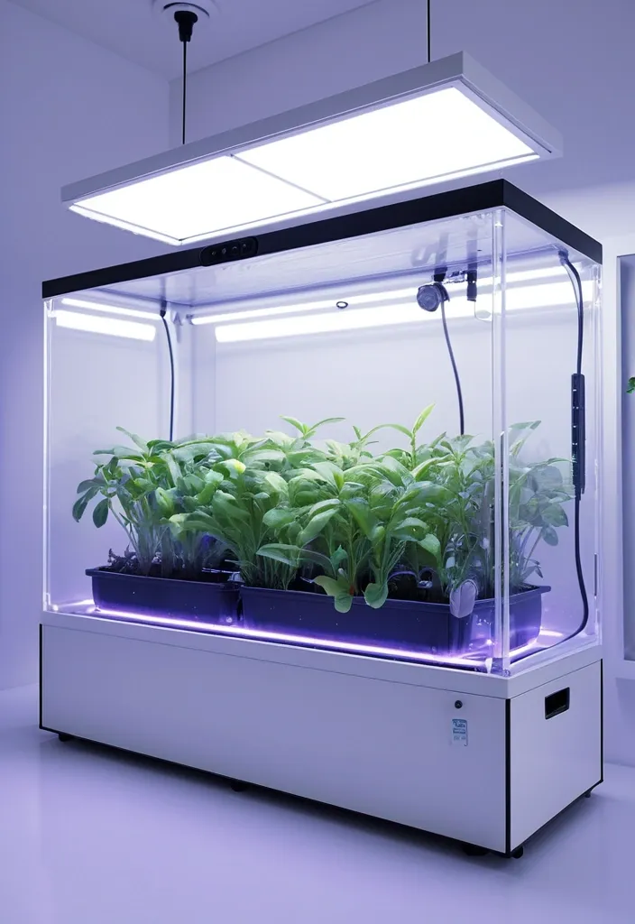 Photorealistic image of a rectangular plastic grow box for indoor plants , size 40cm width , 40cm height , 120cm length , sealed controlled environment with own atmosphere , transparent front acrylic lid fully visible , inside lush green plants growing under LED grow lights , white plastic walls , ventilation fans , hygrometer and thermometer on the side , hydroponic system with water and nutrients , soft blue-purple LED glow from inside , modern minimalistic design , front view , high detail , 8k resolution ,