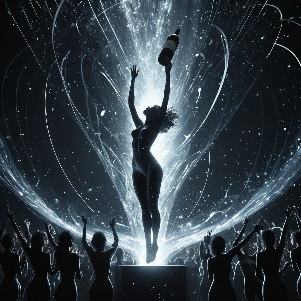 A female dive into a giant wine glass form above , while Many Other people surround. Style: Celestial , ethereal , abstract , digital art black Lighting: Dramatic backlighting , bright glowing particles , contrasting dark background Composition: dynamic diagonal , composition , upward gaze Details: Sparkling gray waves and smoke , streaking white light trails , sense of movement and wonder , magical atmosphere Quality: High detail , 4K , Masterpiece , Rendered in Octane. ,