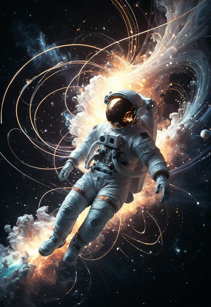 The universe is created from an explosion of energy consisting of cosmic fractal particles. the chaotic movement of planets and stars around a astronaut in full growth. Style: Celestial , ethereal , abstract , digital art smoking: Dramatic backlighting , bright glowing particles , contrasting dark background Composition: dynamic diagonal composition , upward gaze Details: Sparkling white waves and smoke , streaking white light trails , sense of movement and wonder , magical atmosphere Quality: High detail , 4K , Masterpiece , Rendered in Octane. ,