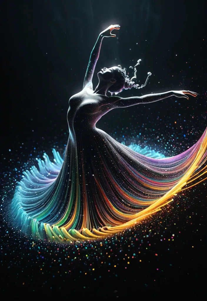 Phenomenal Upside-Down: Aerial perspective , top-down view of a dancer in dynamic motion , pose a dance , rendered entirely as a luminous pointillism sculpture made of thousands of glowing , translucent stripes and beads in a vibrant rainbow gradient. The figure and body curve dissolve into cascading strands of black particles trailing downward , evoking speed and ethereal energy. The gown flows into a dramatic train that forms a large , vortex on the ground. Color palette transitions smoothly from cool gray and black in the upper body to warm dark-blue , gray , and white in the lower body and hands. Intricate circuit frame-like dress and leaves add structural elegance. Dramatic cinematic lighting with strong dots lights and subtle glows against a dark , blurred abstract background with faint black and gray streaks. Moody , futuristic atmosphere blending surrealism and hyper-realism. Close-up side view with slight low-angle perspective for heroic feel , shallow depth of field to emphasize the subject. Ultra-high resolution , intricate details , vibrant yet harmonious colors , masterpiece digital art in the style of advanced 3D rendering and particle simulation. ,