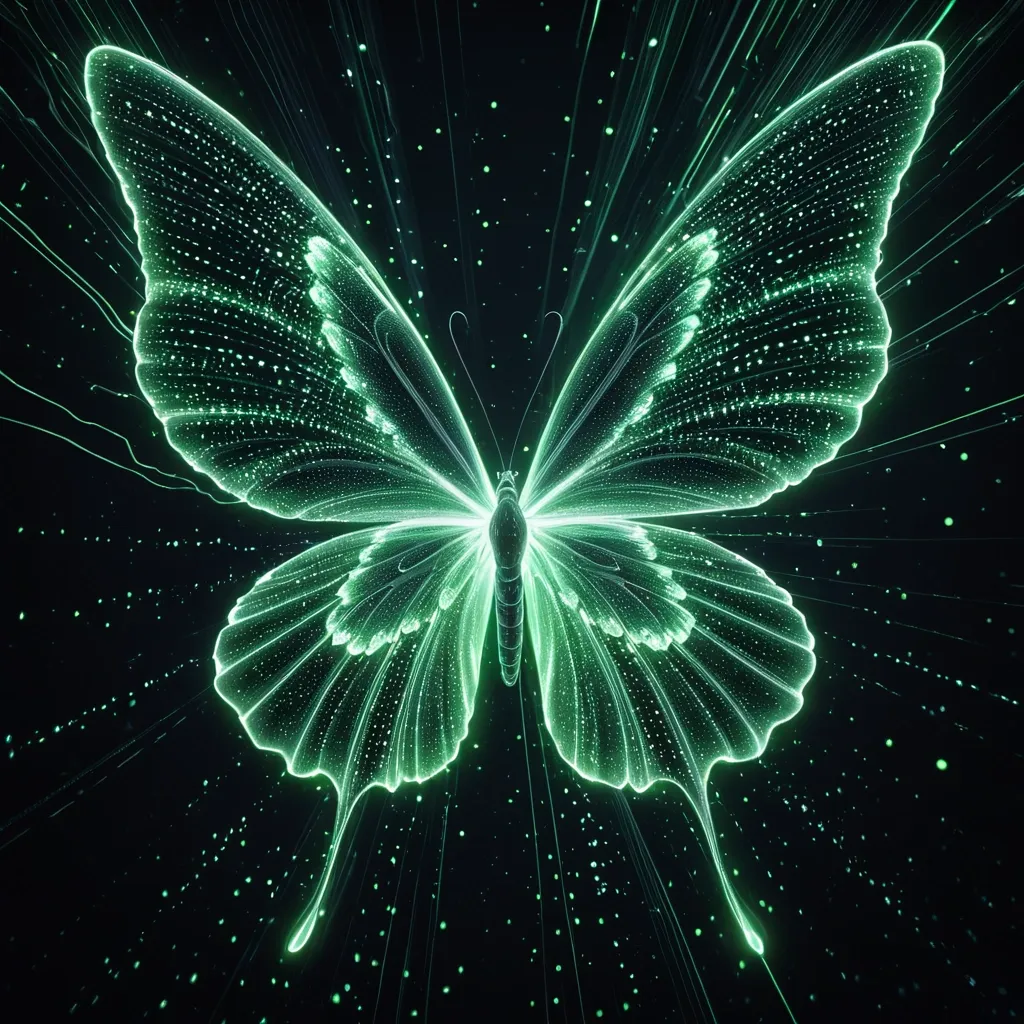 Phenomenal Upside-Down: Aerial perspective , top-down view of a butterfly in dynamic motion , rendered entirely as a luminous pointillism wings made of thousands of glowing , translucent stripes and beads in a Fluorescence green gradient. The wings flows into a dramatic train that forms a large , vortex on the sky. Style: Celestial , ethereal , abstract , digital art black Lighting: Dramatic backlighting , bright glowing particles , contrasting dark background Composition: dynamic diagonal , composition , upward gaze Details: Sparkling gray waves and smoke , streaking white light trails , sense of movement and wonder , magical atmosphere Quality: High detail , 4K , Masterpiece , Rendered in Octane. ,