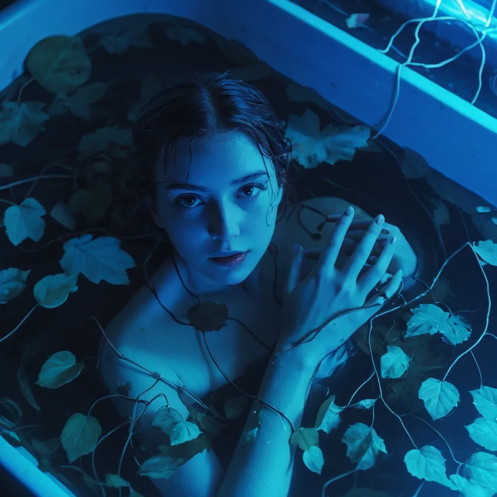 Through the window of a Blues club on a rainy night , a strong , imposing werewolf with dark skin , dreadlocks , and wolf-like eyes watches her from the outside. This illustration is rendered in a graphic novel style , with bold lines and dramatic shadows , reminiscent of Artstation illustrations. Inside , on stage , a slender , graceful vampire , appearing in her late 20s to early 30s with dark skin , long dark dreadlocks , and striking eyes with a subtle reddish hue , captivates the audience in a stunning black dress with red accents. Outside , he stands in casual yet elegant clothing , with a dark overcoat to shield him from the rain , his gaze fixed on her. The street is slick with rain , reflecting the neon lights of the club , creating a poignant contrast between their worlds. The overall color palette is rich and emotional , with deep blues , reds , and blacks dominating , emphasizing their separation and unspoken love. ,