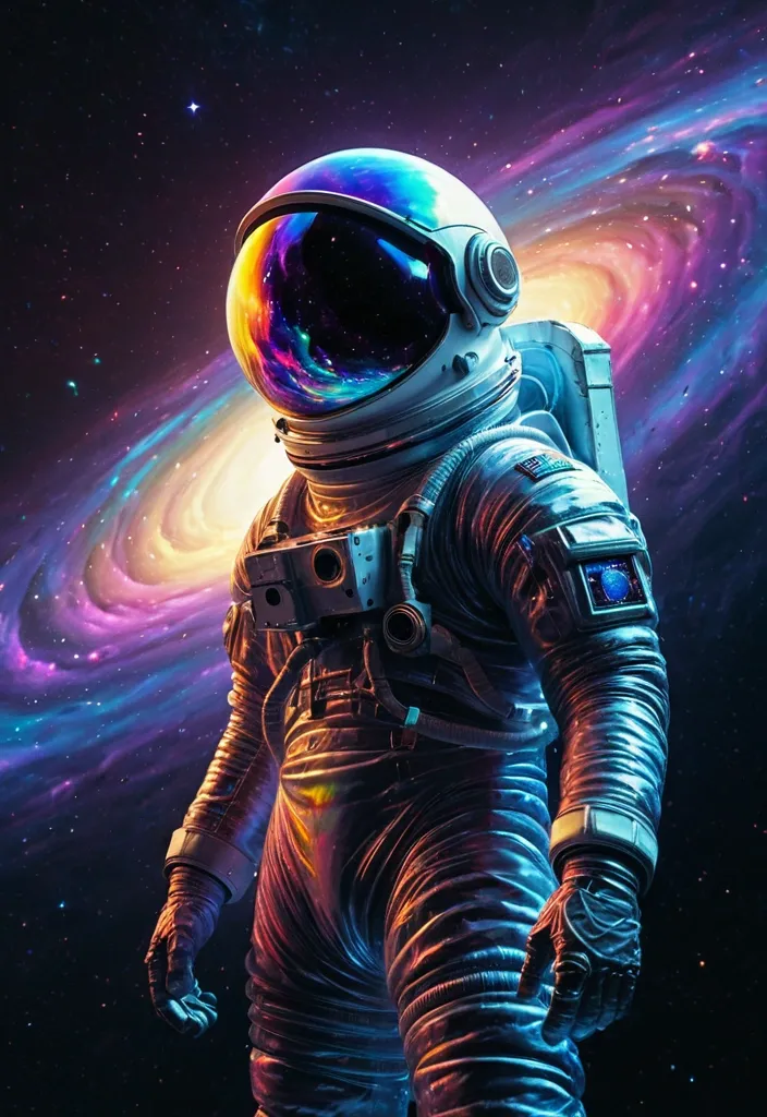 A lone astronaut floating in the vast emptiness of space , gazing at a breathtaking celestial phenomenon. Their helmet reflects a swirling vortex of iridescent colors , a cosmic dance of light and shadow. The art style is hyperrealistic with a focus on atmospheric lighting and deep , vibrant cosmic colors. ,