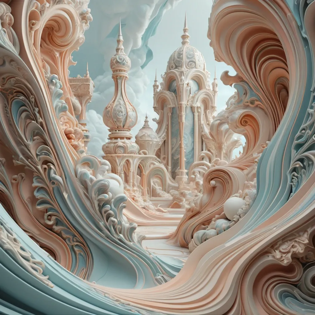 Ultra-detailed surreal sculptural illustration style , organic baroque relief textures flowing across the surface , intricate layered ornamental patterns resembling carved porcelain and liquid marble , smooth pastel color palette with soft blues , warm peach , cream , and muted gold , elegant flowing curves and embossed filigree structures , hybrid of organic forms and futuristic geometric architecture , dreamy surrealism aesthetic , floating geometric frameworks and abstract technical line structures , volumetric clouds and atmospheric elements , soft cinematic lighting , high depth and dimensionality , ultra-clean digital painting , ethereal mood , contemporary surreal concept art , museum-quality visual composition , highly refined textures , balanced minimal background ,