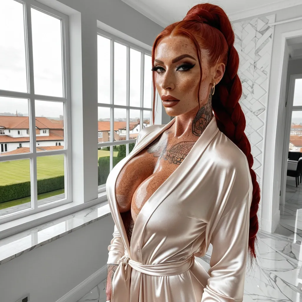 Generate Gorgeous female boss , bimbo , hourglass body , abnormally massive female bodybuilder , gorgeous , close up , full lips , big booty , redheaded , freckles on face and breast , braided design hair , feminine silhouette , too big breast , big booty , sexy thighs abs , silhouette , up close , flexing biceps , beautiful green eyes , legs are iconic and defining physical feature , both visually and in terms of combat ability.wearing an outfit that is a striking blend of elegance , power , and femininity , designed to command attention in any room. The suit is tailored to perfection , hugging the wearer’s curves with precision while emphasizing a structured silhouette. The fabric itself is a refined grey tweed patterned with subtle white grid lines , giving the suit a texture that feels both sophisticated and modern. The blazer features broad blue lapels and gold button accents , adding a luxurious touch that elevates the look beyond typical business attire. The matching high-waisted trousers elongate the frame , further enhancing the poised and commanding effect of the ensemble.The styling choices amplify the boldness of the suit. The inner blouse is a silky , greybutton-down shirt that complements the tweed’s tone while introducing a softer , feminine balance to the sharp tailoring of the jacket. The blouse peeks out neatly from under the blazer , maintaining elegance without drawing focus away from the suit’s commanding cut. Accessories are kept minimal yet intentional: a delicate layered gold necklace and hoop earrings that add glimmers of light and luxury without overpowering the outfit. The choice of voluminous , honey-brown braids cascading down her shoulders frames the face with both confidence and glamour , completing the commanding visual.Altogether , this look communicates a blend of authority and allure. It is business-ready yet fashion-forward , balancing corporate structure with vibrant femininity. The color palette blue , grey and gold avoids being overly delicate , instead embracing the richness of texture , structure , and presence. This is the kind of ensemble that speaks to ambition , sophistication , and personal style—ideal for someone who thrives in positions of influence but insists on expressing her individuality with bold elegance. It’s not just clothing—it’s a statement of power wrapped in grace. In luxury living legs that could crush a watermelon , skirt high boots are a bold and striking statement piece , crafted in glossy black patent leather that gives them a sleek , polished finish. Rising to just below the knee , the boots feature three adjustable buckle straps along the shaft , adding both edge and detail to their design. The towering stiletto heel , paired with a thick platform sole , creates an ultra-dramatic silhouette that elongates the leg and exudes power and confidence. With their combination of shine , height , and structure , these boots perfectly balance fierce femininity with high-fashion allure. Wearing white champagne colored house robe in Manison with tall windows , profile shot ,