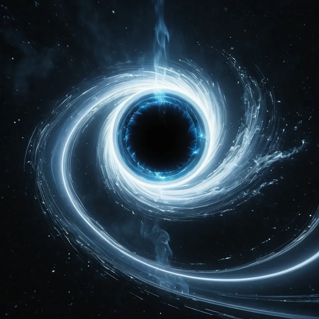 A human arm rises naturally upward from Vortex cosmic maze , landscape snow Melting from a black hole and make them fight but make the white hole is winning and it is a back cover to a story called the white hole and the black hole make the summary on the back , set against a low-resolution metallic black background with subtle snow accents. Style: Celestial , ethereal , abstract , digital art smoking: Dramatic backlighting , bright glowing particles , contrasting dark background Composition: dynamic diagonal composition , upward gaze Details: Sparkling white waves and smoke , streaking white light trails , sense of movement and wonder , magical atmosphere Quality: High detail , 4K , Masterpiece , Rendered in Octane. ,