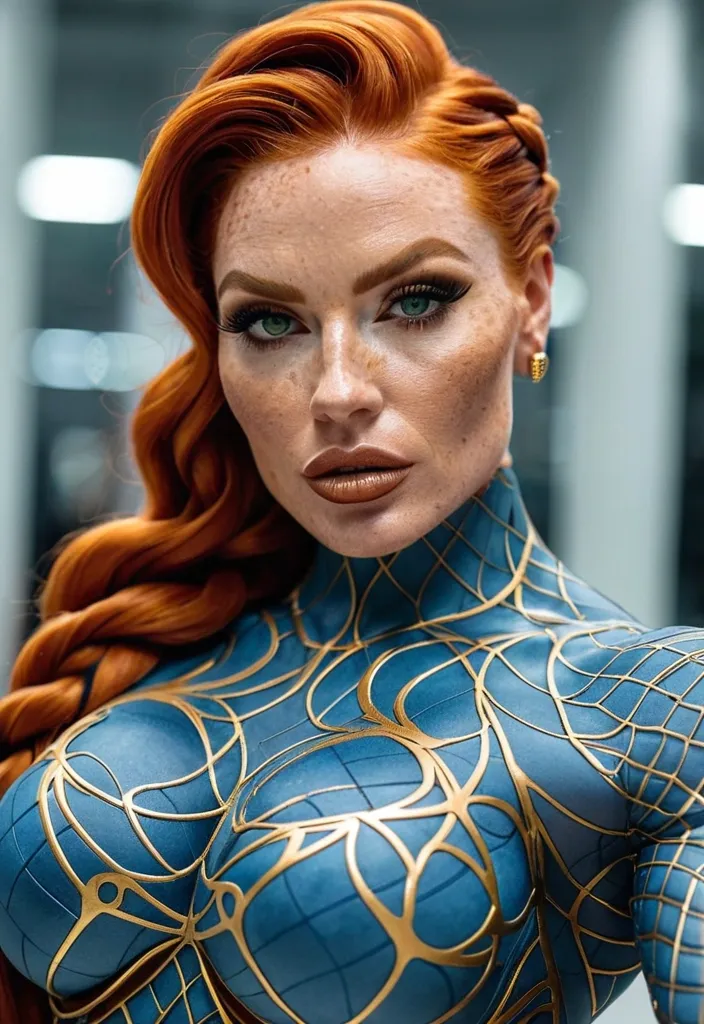 Generate Gorgeous female boss , bimbo , hourglass body , abnormally massive female bodybuilder , gorgeous , close up , full lips , big booty , redheaded , freckles on face and breast , braided design hair , feminine silhouette , too big breast , big booty , sexy thighs abs , silhouette , up close , flexing biceps , beautiful green eyes , legs are iconic and defining physical feature , both visually and in terms of combat ability.wearing an outfit that is a striking blend of elegance , power , and femininity , designed to command attention in any room. The suit is tailored to perfection , hugging the wearer’s curves with precision while emphasizing a structured silhouette. The fabric itself is a refined grey tweed patterned with subtle white grid lines , giving the suit a texture that feels both sophisticated and modern. The blazer features broad blue lapels and gold button accents , adding a luxurious touch that elevates the look beyond typical business attire. The matching high-waisted trousers elongate the frame , further enhancing the poised and commanding effect of the ensemble.The styling choices amplify the boldness of the suit. The inner blouse is a silky , greybutton-down shirt that complements the tweed’s tone while introducing a softer , feminine balance to the sharp tailoring of the jacket. The blouse peeks out neatly from under the blazer , maintaining elegance without drawing focus away from the suit’s commanding cut. Accessories are kept minimal yet intentional: a delicate layered gold necklace and hoop earrings that add glimmers of light and luxury without overpowering the outfit. The choice of voluminous , honey-brown braids cascading down her shoulders frames the face with both confidence and glamour , completing the commanding visual.Altogether , this look communicates a blend of authority and allure. It is business-ready yet fashion-forward , balancing corporate structure with vibrant femininity. The color palette blue , grey and gold avoids being overly delicate , instead embracing the richness of texture , structure , and presence. This is the kind of ensemble that speaks to ambition , sophistication , and personal style—ideal for someone who thrives in positions of influence but insists on expressing her individuality with bold elegance. It’s not just clothing—it’s a statement of power wrapped in grace. Freckles , Light reflecting green eyes , short fingnernails ,