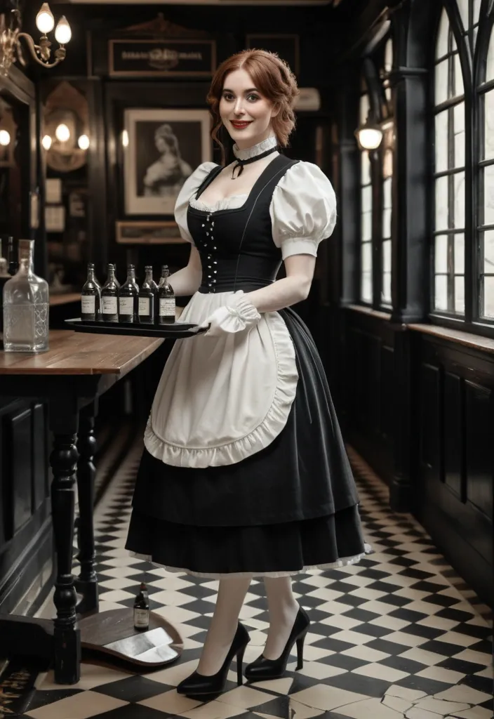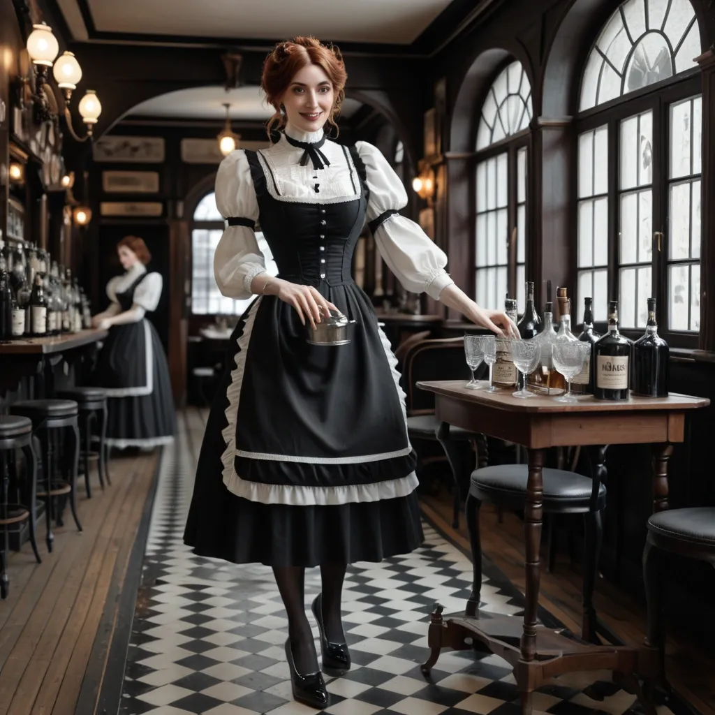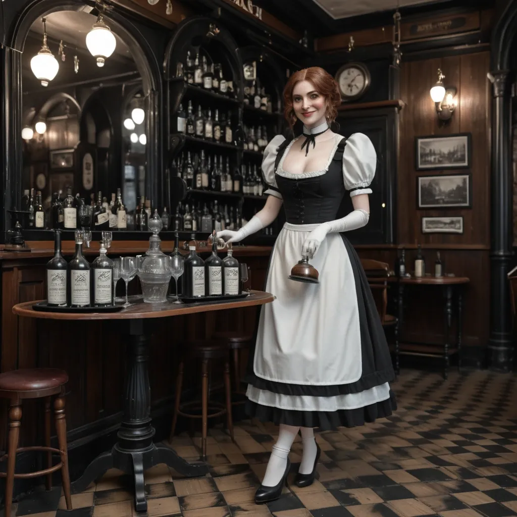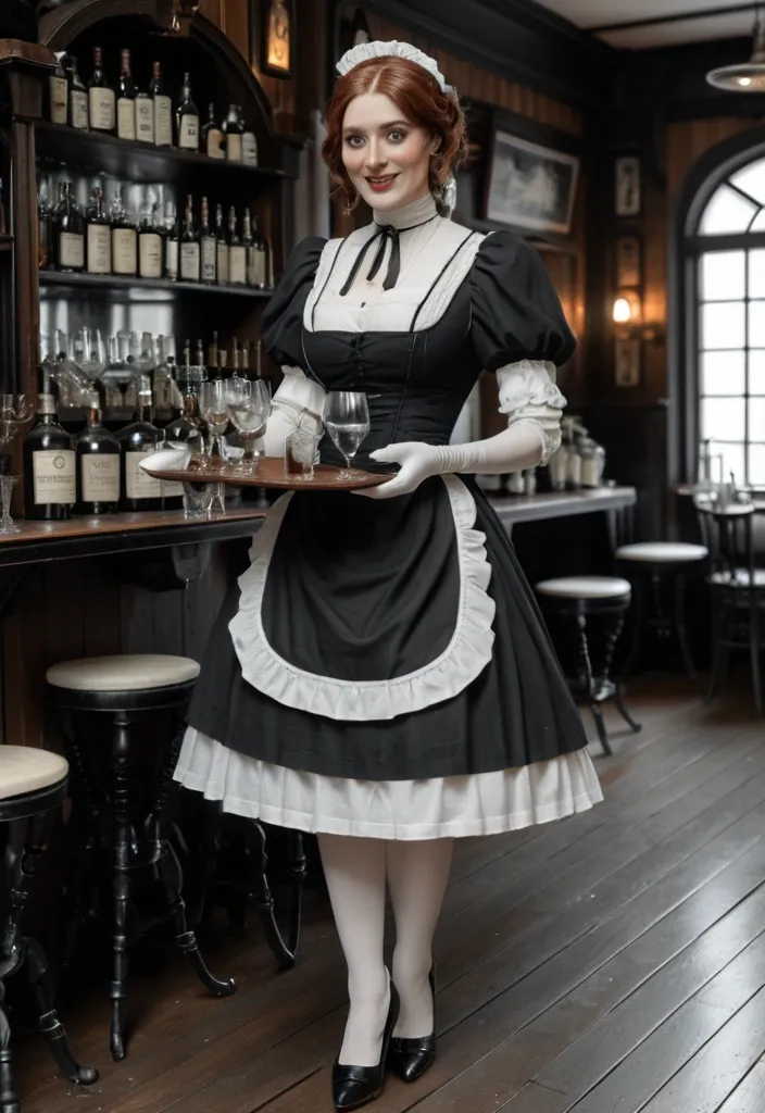 Masterpiece , photorealistic full-length , natural face , beautiful face , depiction of a young woman in her twenties with a short wavy auburn hair , pale ivory skin dressed in victorian black and white maid mini outfit , matching shoes , walking in , very smoky victorian tavern. She's handing a tray with bottles and glasses on , she have a shy smile. cinematic style ,
