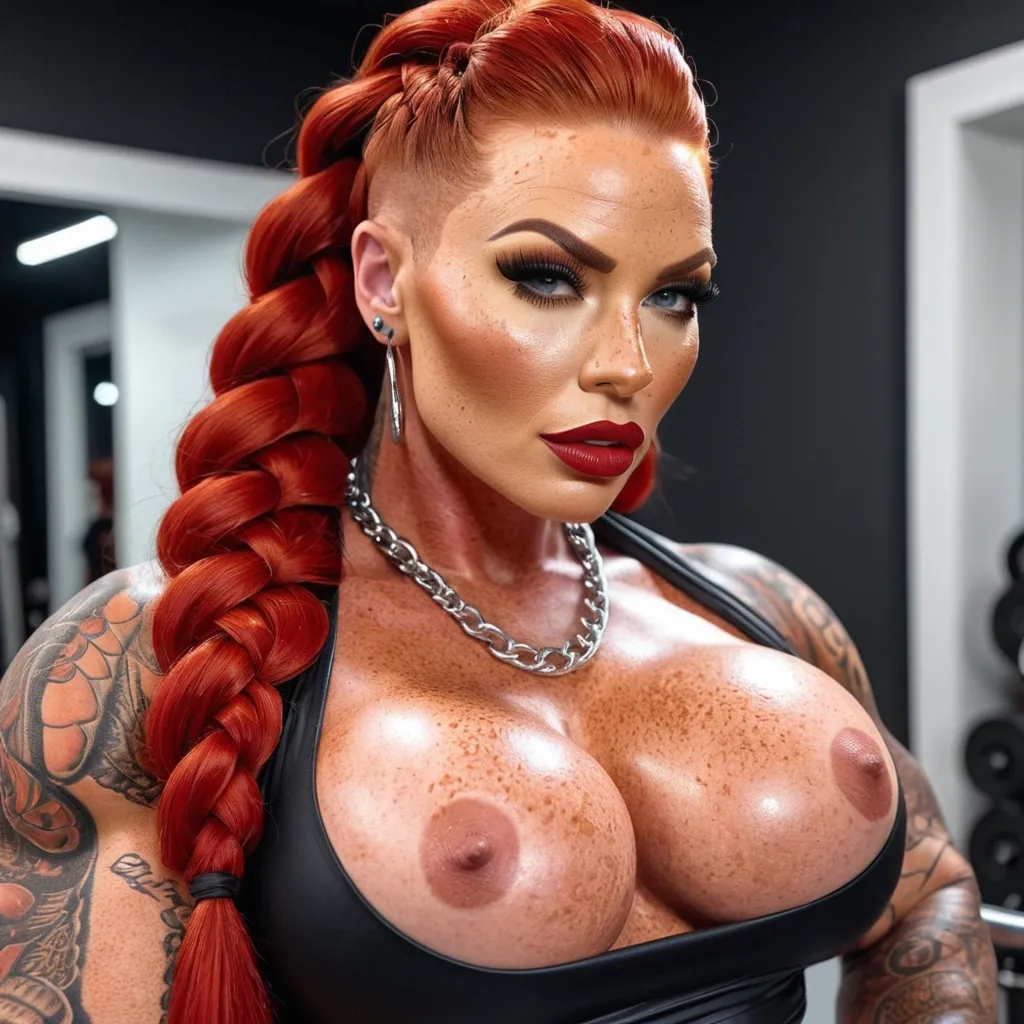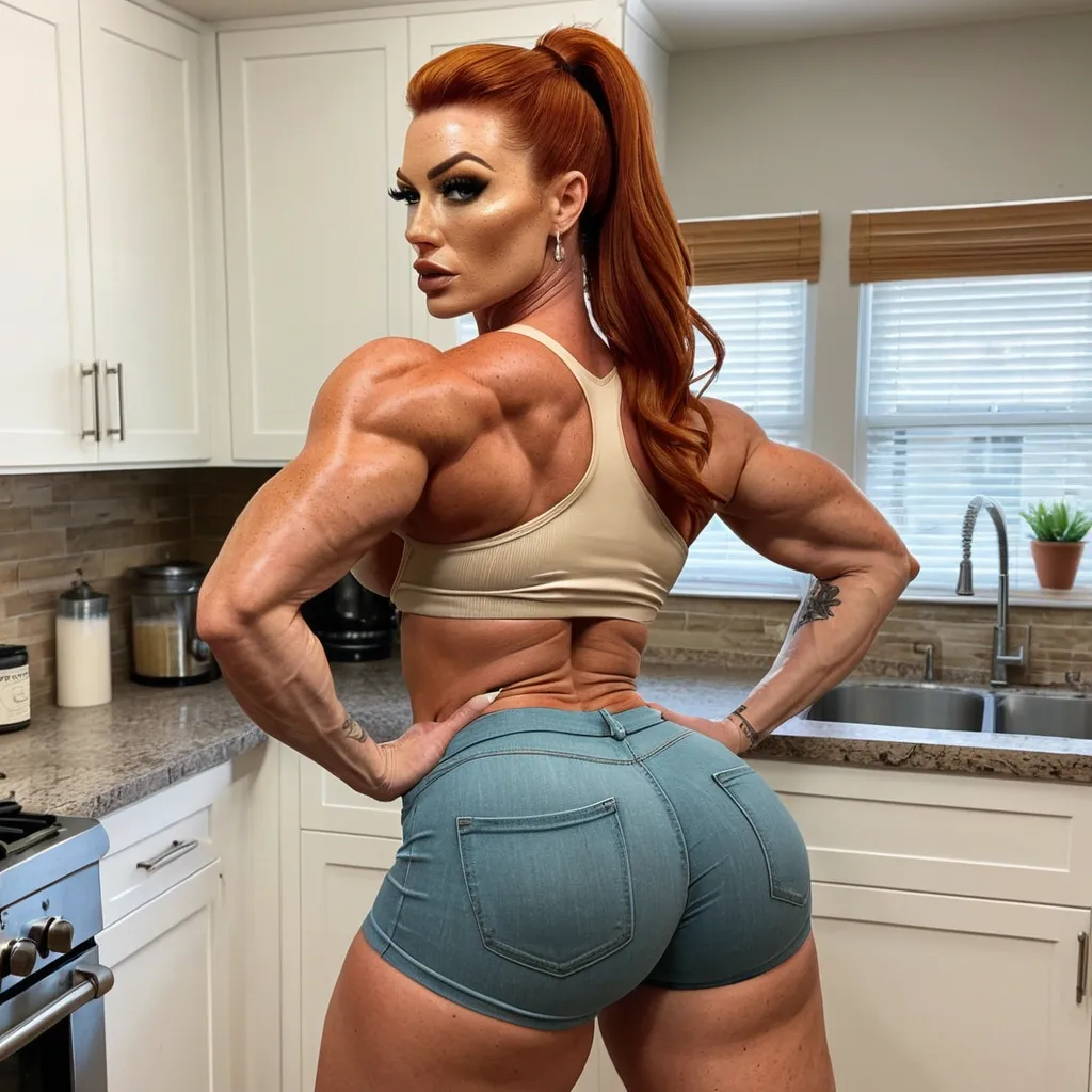 Caucasian Generate Gorgeous female boss , bimbo , hourglass body , female bodybuilder , gorgeous , close up , full lips , big booty , redheaded , freckles on face and breast , pompadour design hair , feminine silhouette , too big breast , big booty , sexy thighs abs , silhouette , up close , flexing biceps , beautiful green eyes , legs are iconic and defining physical feature , both visually and in terms of combat ability.wearing an outfit that is a striking blend of elegance , power , and femininity , designed to command attention in any room. The suit is tailored to perfection , hugging the wearer’s curves with precision while emphasizing a structured silhouette. The fabric itself is a refined grey tweed patterned with subtle white grid lines , giving the suit a texture that feels both sophisticated and modern. The blazer features broad blue lapels and gold button accents , adding a luxurious touch that elevates the look beyond typical business attire. The matching high-waisted trousers elongate the frame , further enhancing the poised and commanding effect of the ensemble.The styling choices amplify the boldness of the suit. The inner blouse is a silky , greybutton-down shirt that complements the tweed’s tone while introducing a softer , feminine balance to the sharp tailoring of the jacket. The blouse peeks out neatly from under the blazer , maintaining elegance without drawing focus away from the suit’s commanding cut. Accessories are kept minimal yet intentional: a delicate layered gold necklace and hoop earrings that add glimmers of light and luxury without overpowering the outfit. The choice of voluminous , honey-brown braids cascading down her shoulders frames the face with both confidence and glamour , completing the commanding visual.Altogether , this look communicates a blend of authority and allure. It is business-ready yet fashion-forward , balancing corporate structure with vibrant femininity. The color palette blue , grey and gold avoids being overly delicate , instead embracing the richness of texture , structure , and presence. This is the kind of ensemble that speaks to ambition , sophistication , and personal style—ideal for someone who thrives in positions of influence but insists on expressing her individuality with bold elegance. It’s not just clothing—it’s a statement of power wrapped in grace. In luxury living legs that could crush a watermelon , skirt and computer lab standing over computer close up , full lips , big booty , redheaded , freckles on face and breast , hair , feminine silhouette , too big breast , big booty , sexy thighs abs , silhouette , up close , flexing biceps , beautiful green eyes , beige tank top , blue jean shorts , standing in kitchen ,