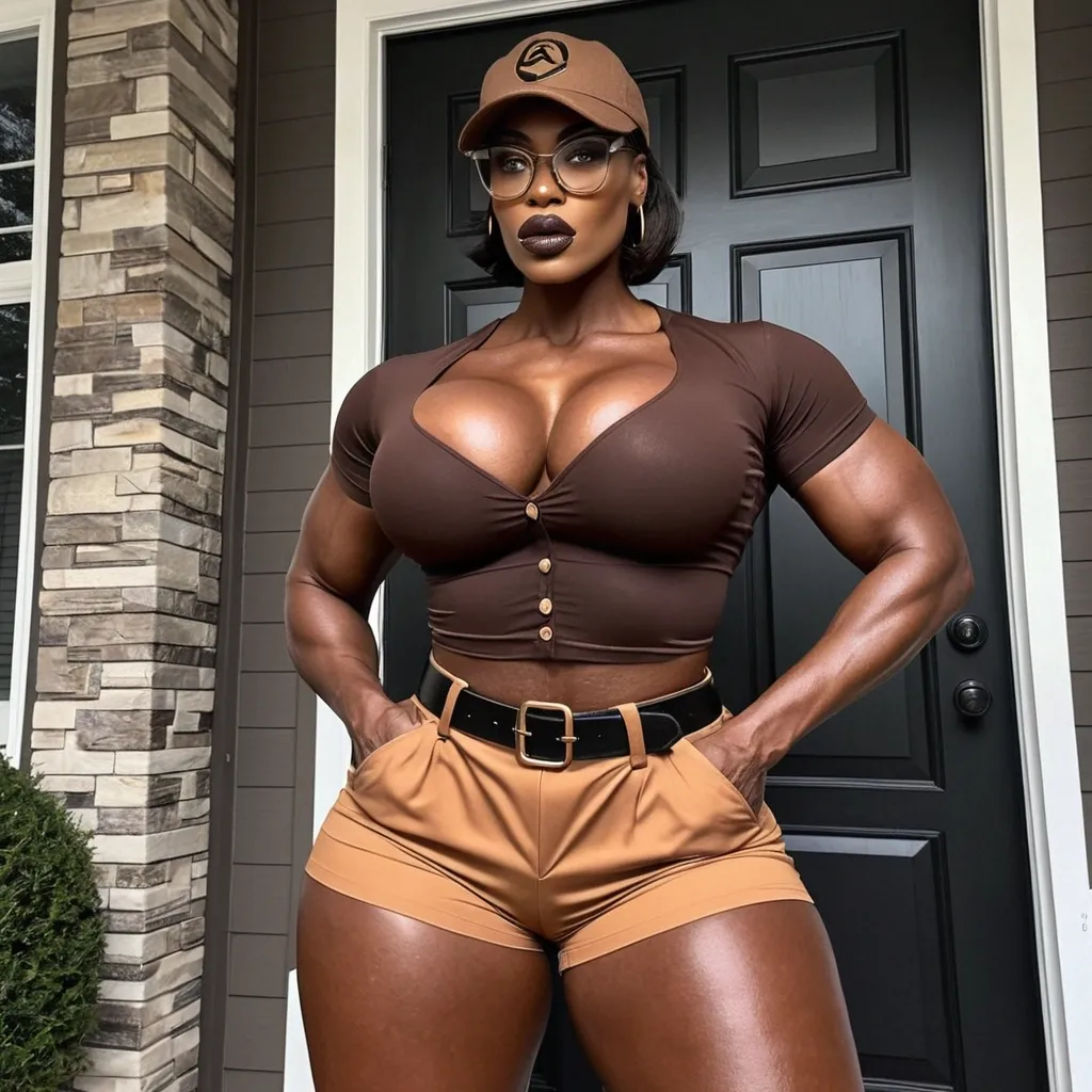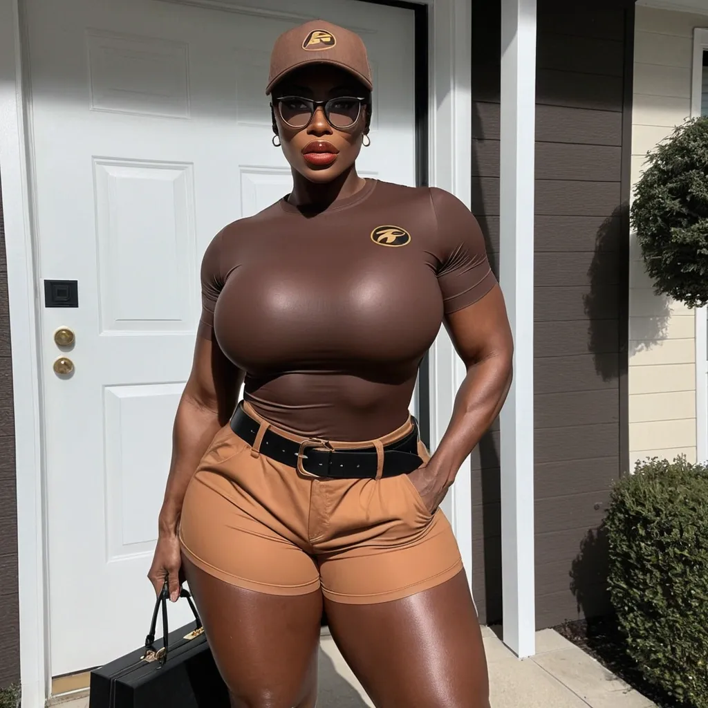 Generate Gorgeous female boss , bimbo , eye glasses , very dark-skinned African-American woman , very big lips , hourglass body , abnormally massive female bodybuilder , gorgeous , close up , full lips , big booty , brown hair , short pixie hair , feminine silhouette , too big breast , big booty , sexy thighs abs , silhouette , up close , flexing biceps , beautiful brown eyes , legs are iconic and defining physical feature , both visually and in terms of combat ability.wearing an outfit that is a striking blend of elegance , power , and femininity , designed to command attention in any room. The suit is tailored to perfection , hugging the wearer’s curves with precision while emphasizing a structured silhouette. The fabric itself is a refined grey tweed patterned with subtle white grid lines , giving the suit a texture that feels both sophisticated and modern. The blazer features broad blue lapels and gold button accents , adding a luxurious touch that elevates the look beyond typical business attire. The matching high-waisted trousers elongate the frame , further enhancing the poised and commanding effect of the ensemble.The styling choices amplify the boldness of the suit. The inner blouse is a silky , greybutton-down shirt that complements the tweed’s tone while introducing a softer , feminine balance to the sharp tailoring of the jacket. The blouse peeks out neatly from under the blazer , maintaining elegance without drawing focus away from the suit’s commanding cut. Accessories are kept minimal yet intentional: a delicate layered gold necklace and hoop earrings that add glimmers of light and luxury without overpowering the outfit. The choice of voluminous , honey-brown braids cascading down her shoulders frames the face with both confidence and glamour , completing the commanding visual.Altogether , this look communicates a blend of authority and allure. It is business-ready yet fashion-forward , balancing corporate structure with vibrant femininity. The color palette blue , grey and gold avoids being overly delicate , instead embracing the richness of texture , structure , and presence. This is the kind of ensemble that speaks to ambition , sophistication , and personal style—ideal for someone who thrives in positions of influence but insists on expressing her individuality with bold elegance. It’s not just clothing—it’s a statement of power wrapped in grace. In luxury living legs that could crush a watermelon , skirt high boots are a bold and striking statement piece , crafted in glossy black patent leather that gives them a sleek , polished finish. Rising to just below the knee , the boots feature three adjustable buckle straps along the shaft , adding both edge and detail to their design. The towering stiletto heel , paired with a thick platform sole , creates an ultra-dramatic silhouette that elongates the leg and exudes power and confidence. With their combination of shine , height , and structure , these boots perfectly balance fierce femininity with high-fashion allure. High cheekbones , prominent jawline , gorgeous big brown eyes , enormous breast , in brown button up T-shirt , brown shorts and black belt , black boots and the brown baseball cap carrying a box standing at the front door and it’s suburban neighborhood , enormous booty ,