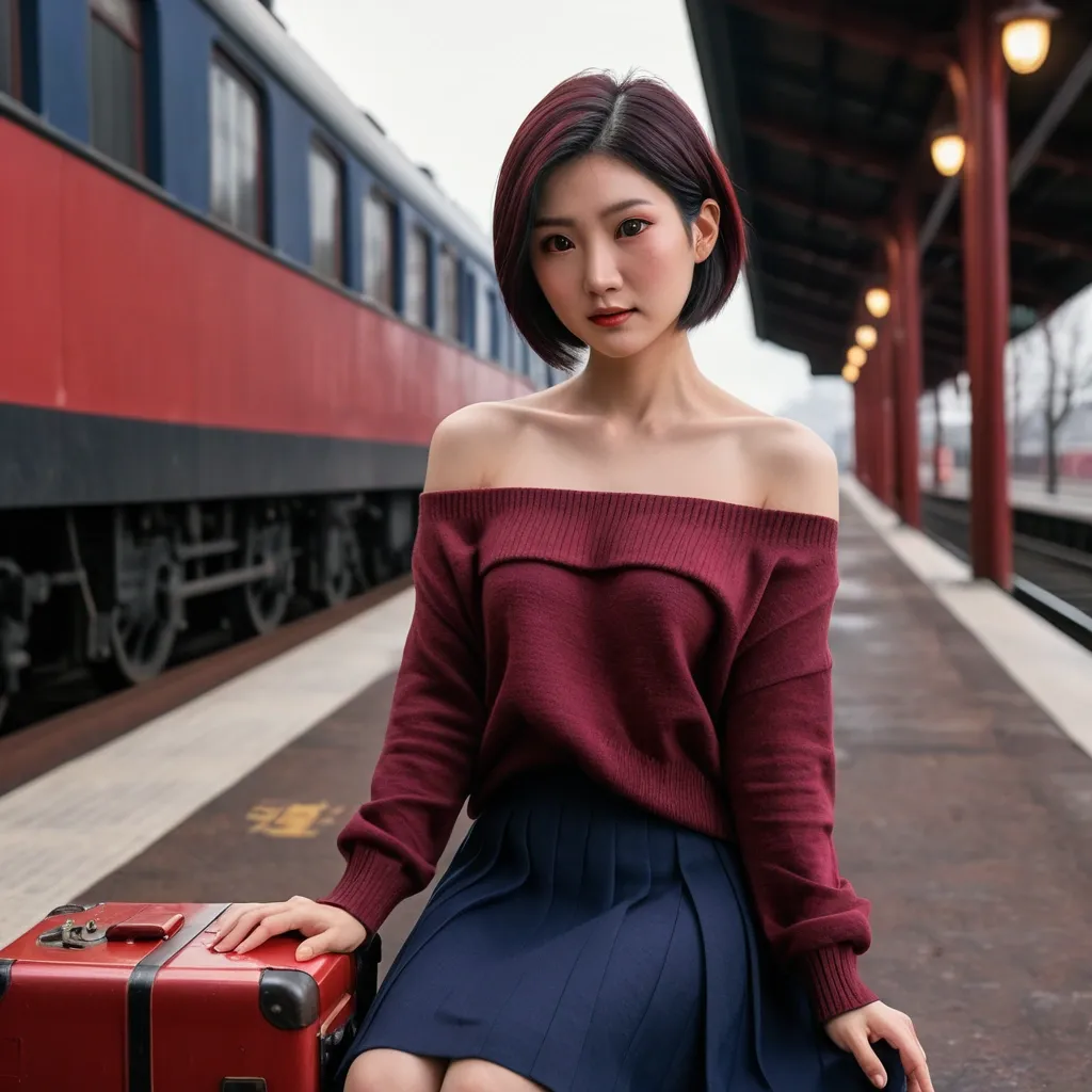 This is a highly realistic , almost photographic illustration. It beautifully captures the essence of an Asian woman's beauty , with vibrant colors , soft tones , and warm , gentle lighting. (Wine-red off-shoulder sweater: 1.3) , (Long navy blue skirt) , (Short hair parted in the middle: 1.3) , (Dark brown eyes: 1.3). The scene depicts her sitting on a suitcase at a raildroad station , an old steam locomotive black and red is approaching in background ,