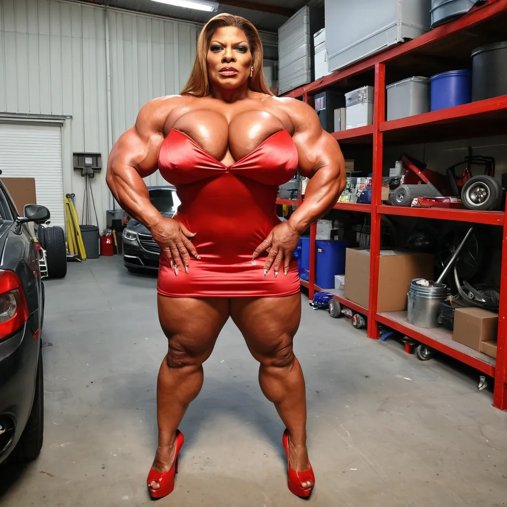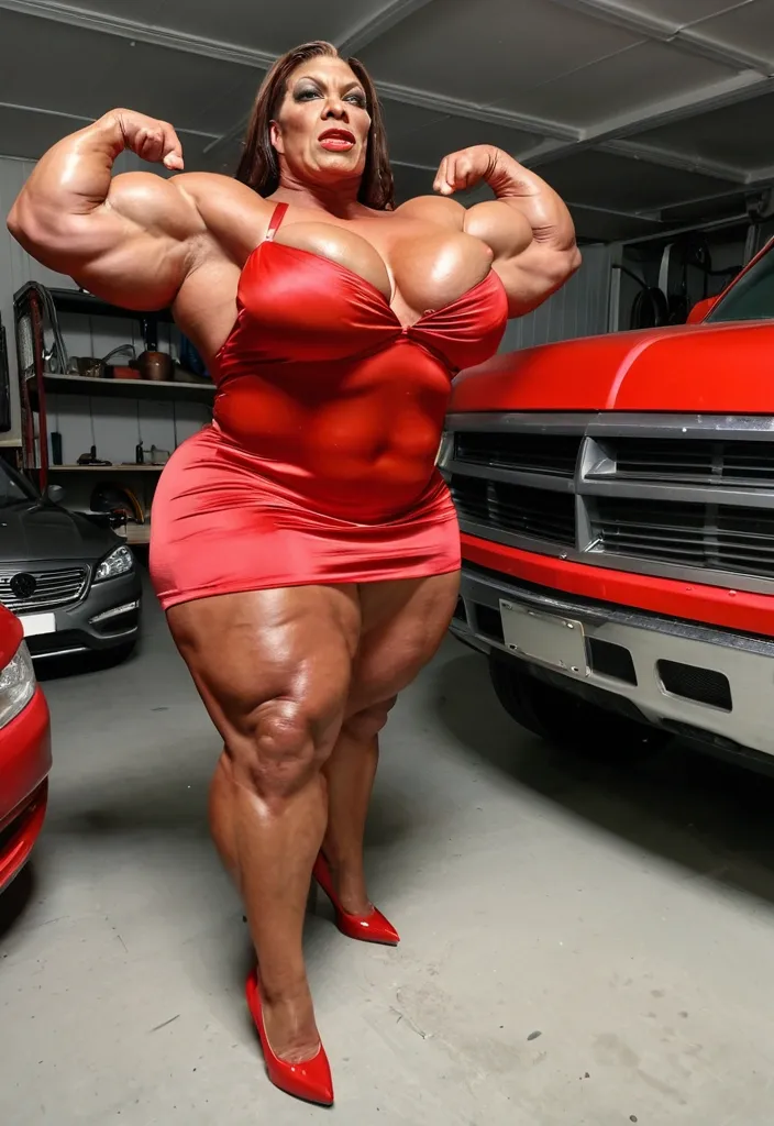 À giant muscular chubby femalebodybuilder , housewife woman BBW musclée , heavy weight bodybuildeuse géante et plantureuse with giant chest , imposante dame massive , beautiful make up Queen Latifah face , in a garage , avec de gros seins , énormes biceps musclés , in red satin transparent very short mini loose strapless sundress with heels , exposant les seins , bras musclés exposés , dominante , jambes massives exposées , agressive , ,
