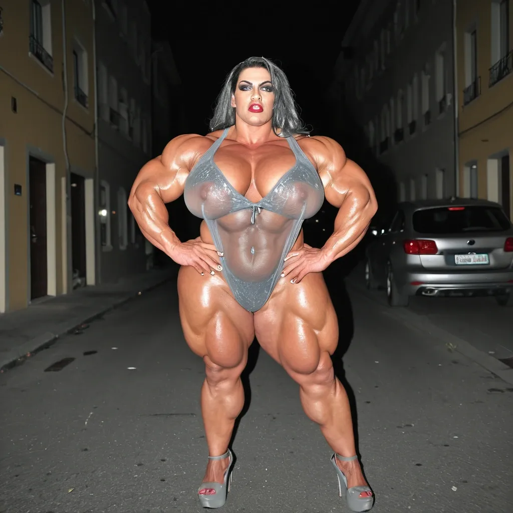 À giant muscular chubby femalebodybuilder , housewife woman BBW musclée , heavy weight bodybuildeuse géante et plantureuse with giant chest , imposante dame massive , beautiful make up Madonna face , in a street at night , avec de gros seins , énormes biceps musclés , in gray laces transparent very short mini loose nightgown with heels , exposant les seins , bras musclés exposés , dominante , jambes massives exposées , agressive , ,