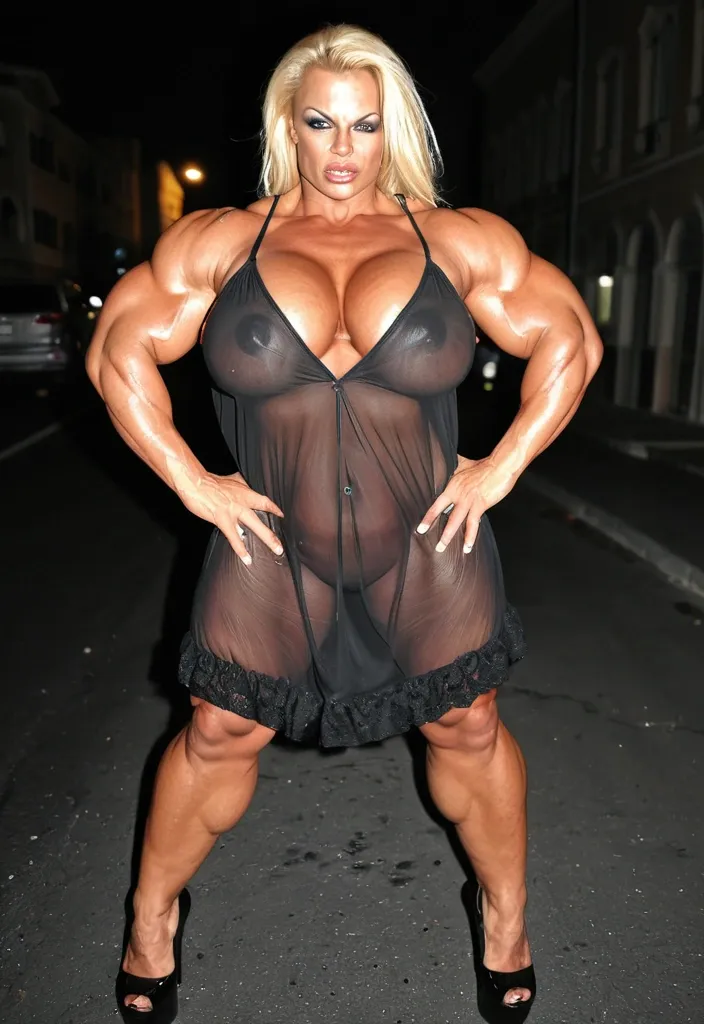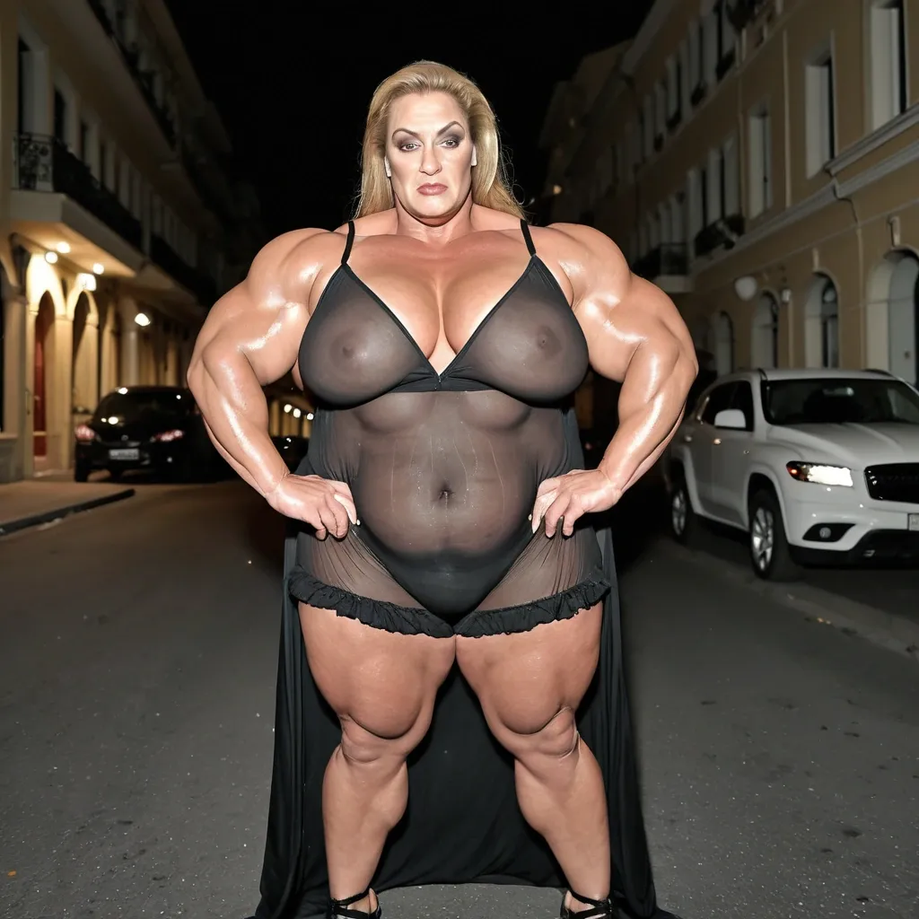 À giant muscular chubby femalebodybuilder , housewife woman BBW musclée , heavy weight bodybuildeuse géante et plantureuse with giant chest , imposante dame massive , beautiful make up Pamela Anderson face , in a street at night , avec de gros seins , énormes biceps musclés , in black laces transparent very short mini loose nightgown with heels , exposant les seins , bras musclés exposés , dominante , jambes massives exposées , agressive , ,