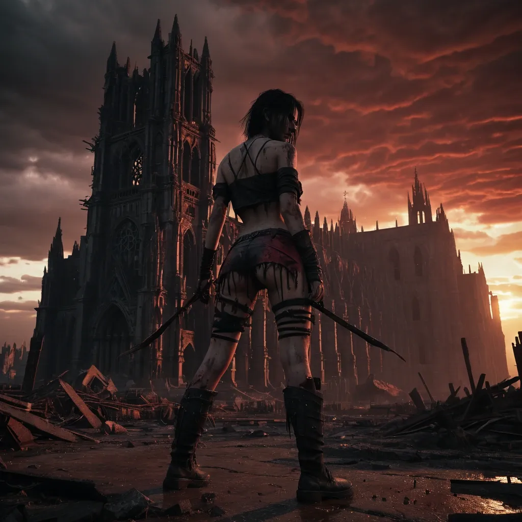 Close up view on A female tribal wearing tattered short leather , pale strong thighs stands silhouetted against a blood-red , post-apocalyptic sunset , dark clouds roiling. The ruins of a once-grand gothic cathedral loom behind her , its spires broken and twisted. Dust motes dance in the harsh , dramatic light , casting long , eerie shadows. The scene is rendered in a hyperrealistic , cinematic style with intense , moody lighting reminiscent of a Fallout Church ,