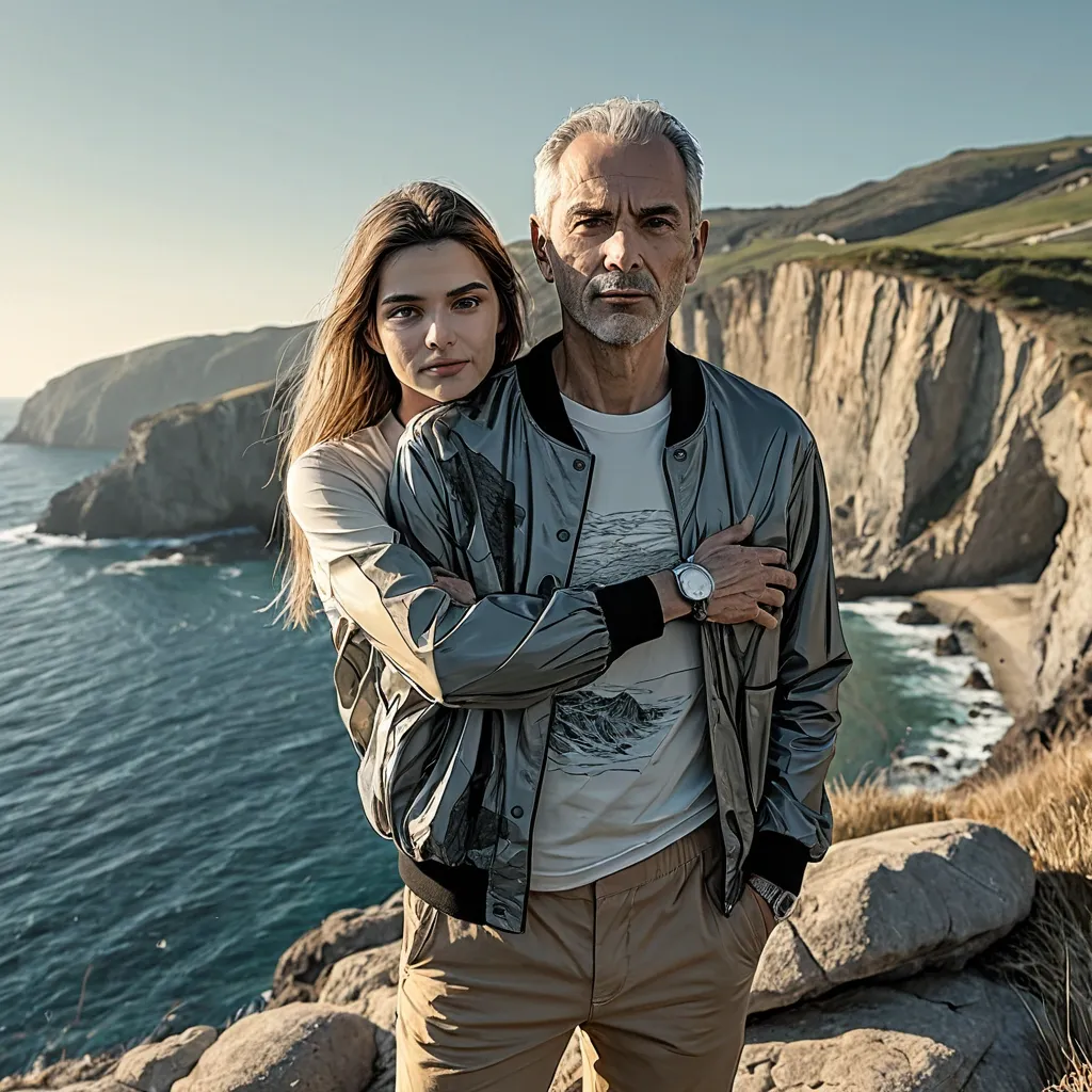A medium shot of a mature man (using the face from the reference image) standing on a coastal cliff. he is looking directly at the camera with a neutral expression. She is holding her left arm across her body to check a silver watch on her wrist with her right hand. The Hybrid Art Style The image features a unique "sketch-to-life" conceptual effect. Her lower half (tan chinos) and the background (ocean and rocky cliffs) are rendered in a realistic , cinematic photographic style. However , his upper clothing is a transparent , black-ink line drawing of a bomber jacket over a t-shirt. The background scenery is visible through the "sketched" jacket , creating a surreal , layered look. Setting & Lighting Background: A blurred , sunny coastal landscape with blue ocean water and rugged cliffs under a clear sky. Lighting: Bright , natural golden-hour sunlight that creates soft shadows and emphasizes the realistic textures of her skin , hair , and trousers against the minimalist ink lines of the jacket.Use 100% face Do not alter the face. Do not change my face ,