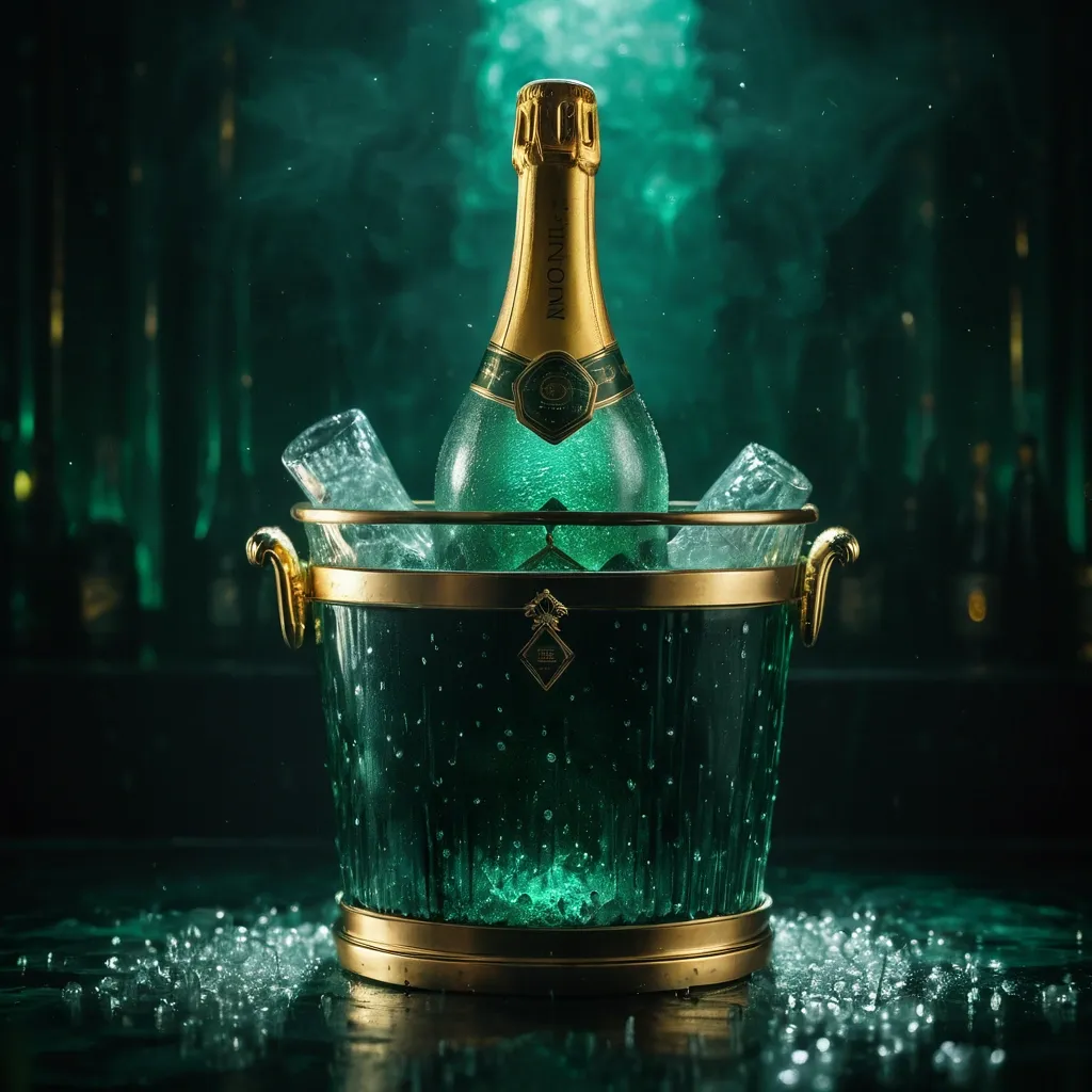 A luxury cold beverage bottle placed inside a crystal ice bucket with glowing condensation droplets on the glass. Premium dark emerald and gold color theme , soft smoke effect , elegant bar atmosphere , dramatic rim lighting , sparkling ice cubes , realistic liquid texture , cinematic luxury drink advertisement , high-end commercial photography , shallow depth of field , ultra-realistic , 9:16 vertical composition. ,