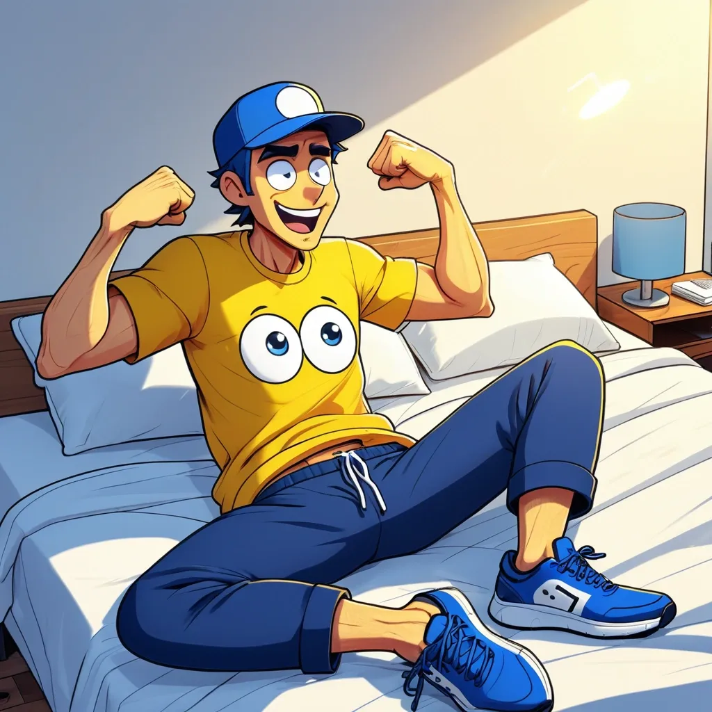 A cute cartoon boy with a yellow 'Cool' t-shirt layered over a white long-sleeve shirt , dark navy pants , blue sneakers , and a blue cap worn sideways. Big expressive eyes , cheerful and energetic personality. Cartoon/anime illustration style , bright vivid colors , clean lines , child-friendly art. Scene 2: The boy stretches and yawns in bed , slowly waking up , rubbing his eyes with both fists. Sunlight now fully lighting the room. Messy bedsheets , sleepy but cute expression. resolution 16.9 ,