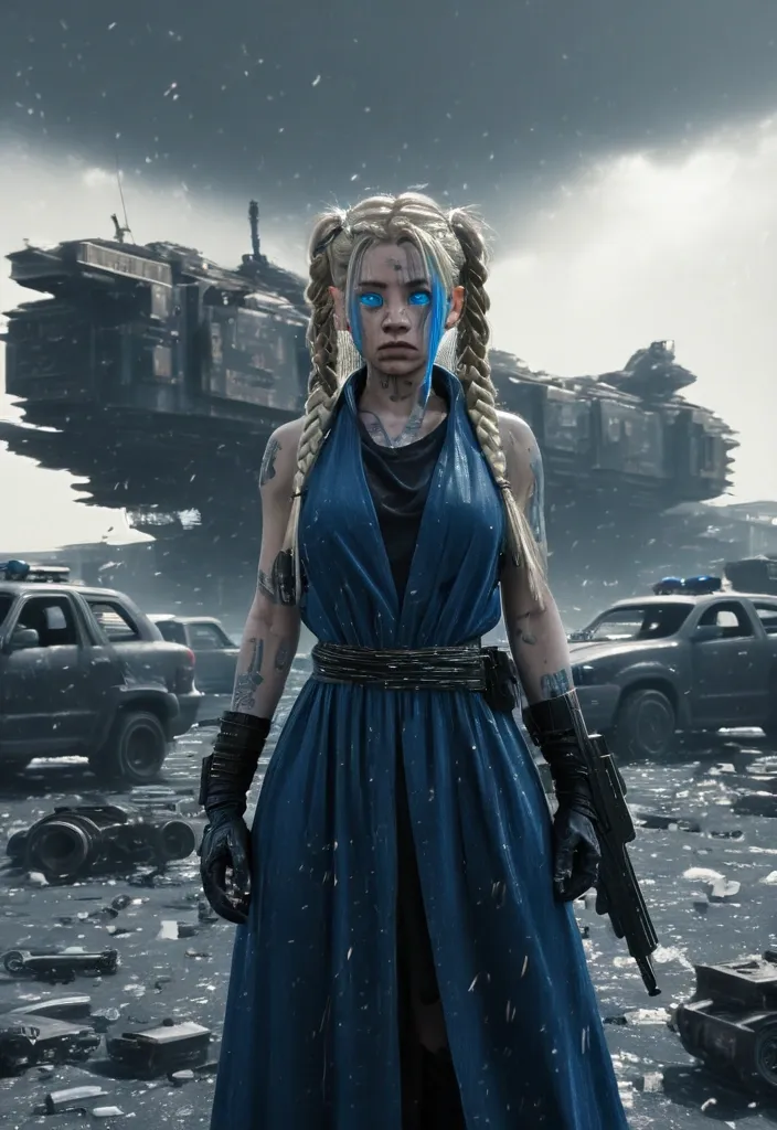 A post-apocalyptic scene featuring a fierce blonde fatty woman blue eyes wearing a long flowing dark blue dress , Her hair is braided in Twin ponytails long black braid , dusky skin , requesting a cocktail. The setting is a dusty , desolate futuristic mecha inspired base with scattered debris and remnants of other vehicles , under a dramatic sky filled with scattered clouds (dramatic:1.2). in a cyberpunk dystopian future. Compositionally , the pilot is centered in the foreground , with the aircraft emerging from the background , drawing the viewer's eye (focus:1.2). Avoid clichés like generic sci-fi elements or cartoonist designs (negative prompt:2). Emphasize realism and detail , focusing on textures and atmospheric depth , leading the eye into the scene while emphasizing its detail. Focus on hyper-realistic textures (texture:1.2) and vivid colors (color:1.2) ,