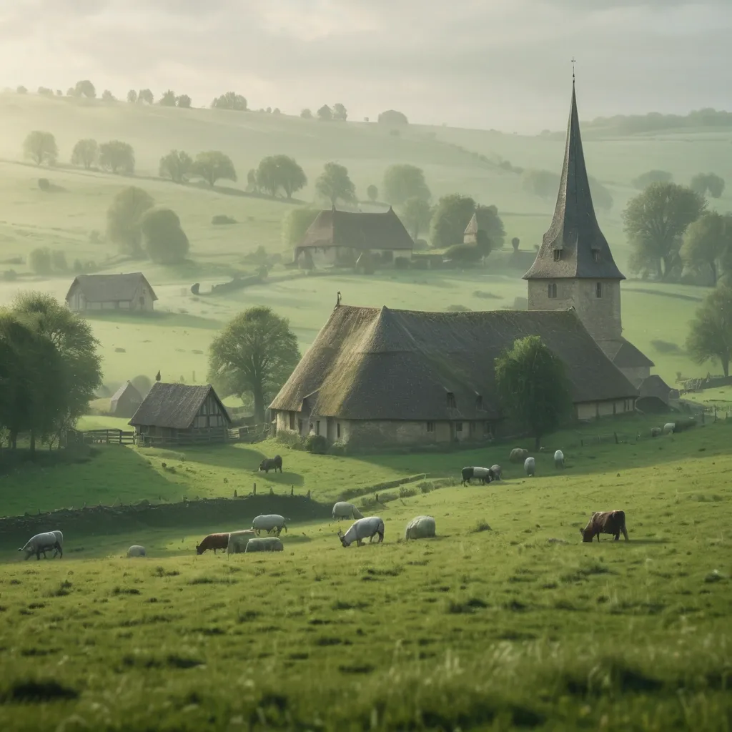 Normandy in 1300 , rolling green farmland dotted with timber cottages and grazing cattle , stone church spire over misty meadows , soft morning light after rain , late spring , Style: hyperrealistic with a painterly texture , reminiscent of historical reconstruction art , detailed and atmospheric with subtle depth of field , Wide view , Side View , 4K. ,