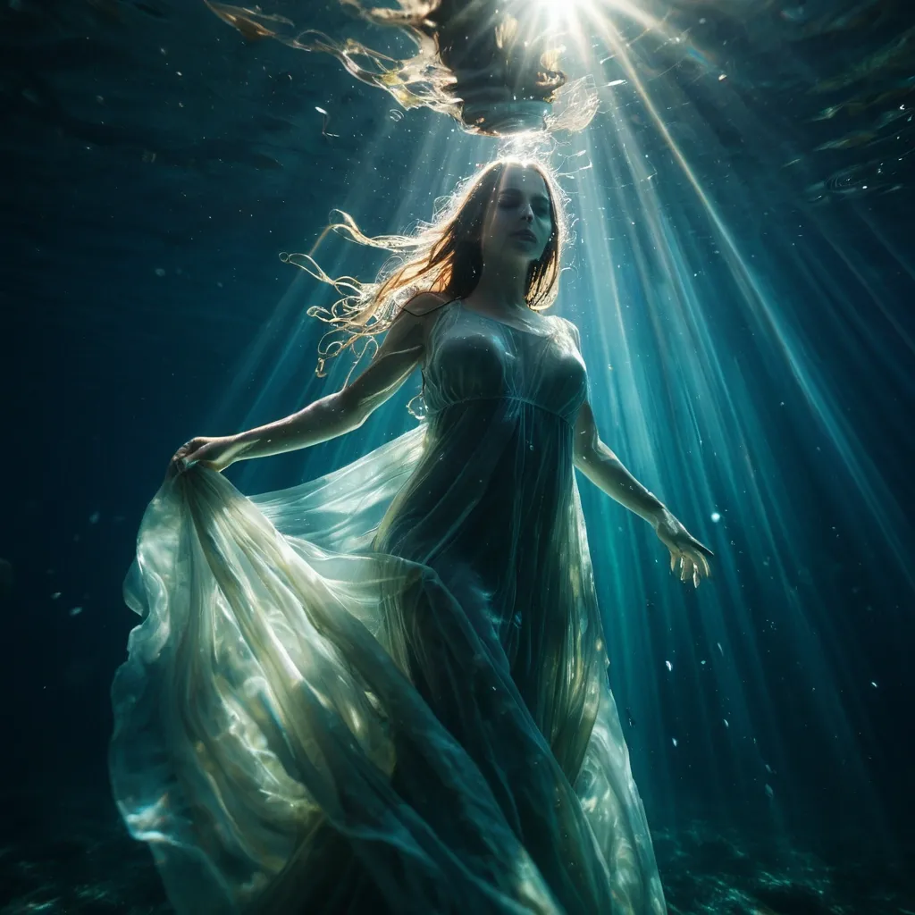 Underwater series /// High detail RAW color photo professional , highly detail face: 1.4 , a detailed portrait of a woman floating underwater wearing long flowing dress , nymph style , amazing underwater , detailed skin , wet clothes , wet hair , see-through clothes , lens flare , shade , tindal effect , lens flare , backlighting , bokeh ,