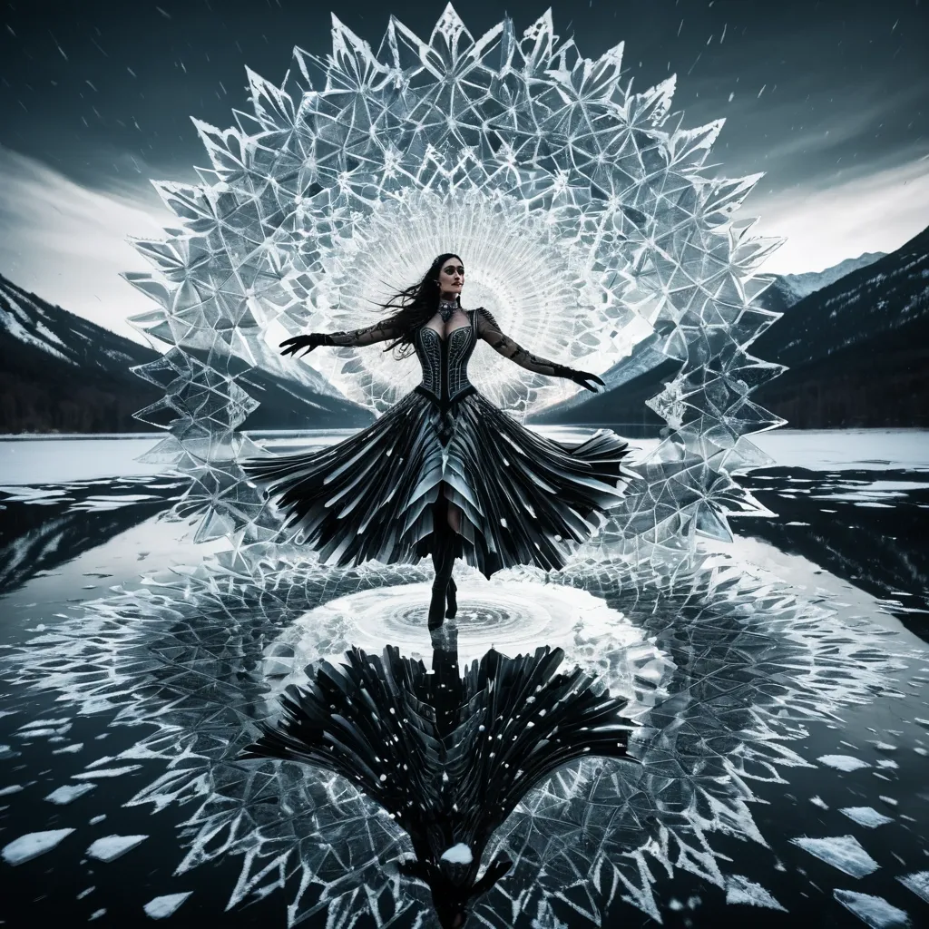 A surreal landscape rippling reflections dance across a frozen lake in the middle of winter , capturing a dancer in dynamic motion , rendered entirely as a vortex dress made of thousands of razor-sharp glass shards meticulously arranged in intricate hexagonal snowflake patterns that seem to stretch across the water's surface. The image captures the mood with dramatic chiaroscuro lighting and the detailed , metallic aesthetic of steampunk art , enhanced by a vintage photography feel. ,