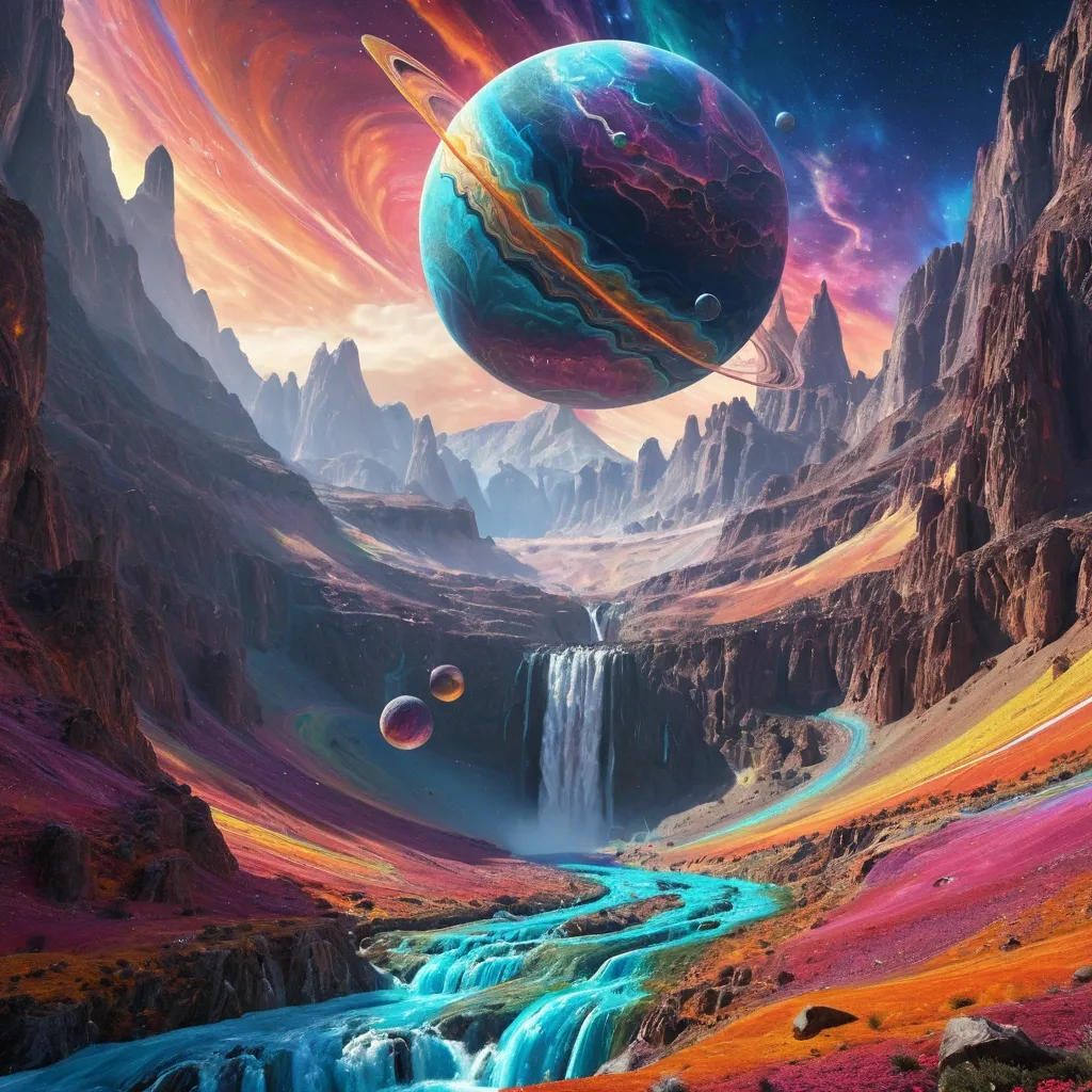 In a vibrant and otherworldly landscape , a colossal planet adorned with rings looms over a surreal terrain , where technicolor waterfalls cascade from the skies , blending seamlessly with the colorful rivers that wind through rugged mountains. This celestial wonder merges fantasy with an awe-inspiring cosmic perspective , inviting explorers to venture into the unknown. ,
