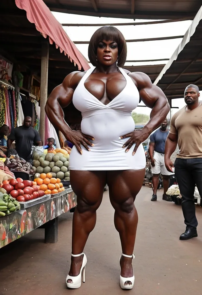 À African giant muscular chubby femalebodybuilder , housewife country woman BBW musclée , heavy weight bodybuildeuse géante et plantureuse with giant chest , imposante dame massive , beautiful make up Viola Davis face , in a African market , avec de gros seins , énormes biceps musclés , in white satin transparent short mini loose sundress with heels , exposant les seins , bras musclés exposés , dominante , jambes massives exposées , agressive , ,
