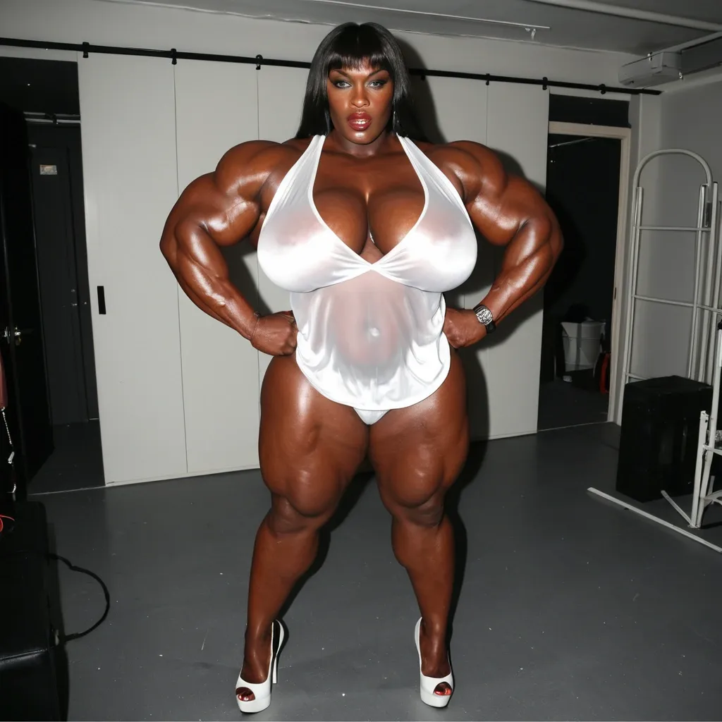 À african giant muscular chubby femalebodybuilder , housewife woman BBW musclée , heavy weight bodybuildeuse géante et plantureuse with giant chest , imposante dame massive , beautiful make up Naomi Campbell face , in a back stage room , avec de gros seins , énormes biceps musclés , in white satin transparent shortest mini loose night sleeveless shirt with heels , exposant les seins , bras musclés exposés , dominante , jambes massives exposées , agressive , ,