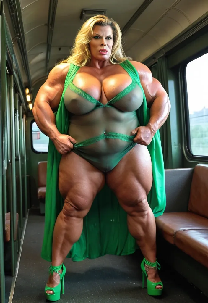 À giant muscular chubby femalebodybuilder , housewife woman BBW musclée , heavy weight bodybuildeuse géante et plantureuse with giant chest , imposante dame massive , beautiful make up , Kim Basinger face , in a train , avec de gros seins , énormes biceps musclés , in green laces transparent short mini loose nightgown with heels , exposant les seins , bras musclés exposés , dominante , jambes massives exposées , agressive , ,