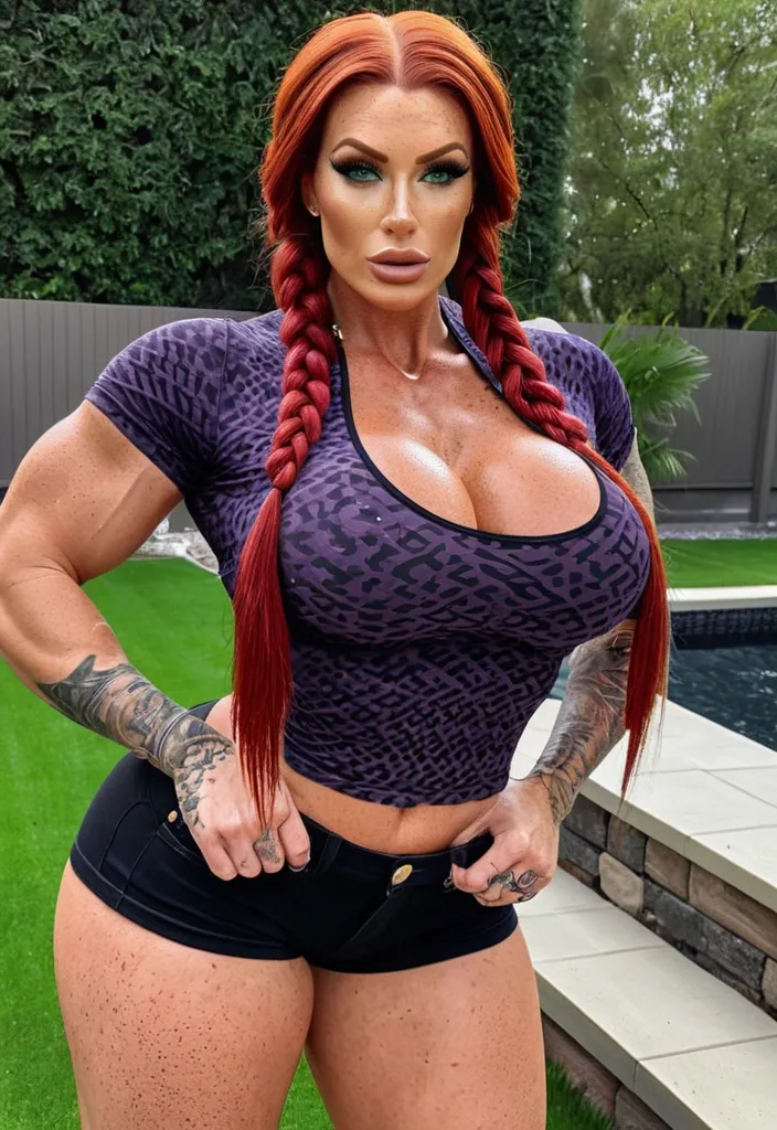 Generate Gorgeous female boss , bimbo , hourglass body , abnormally massive female bodybuilder , gorgeous , close up , full lips , big booty , redheaded , freckles on face and breast , braided design hair , feminine silhouette , too big breast , big booty , sexy thighs abs , silhouette , up close , flexing biceps , beautiful green eyes , legs are iconic and defining physical feature , both visually and in terms of combat ability.wearing an outfit that is a striking blend of elegance , power , and femininity , designed to command attention in any room. The suit is tailored to perfection , hugging the wearer’s curves with precision while emphasizing a structured silhouette. The fabric itself is a refined grey tweed patterned with subtle white grid lines , giving the suit a texture that feels both sophisticated and modern. The blazer features broad blue lapels and gold button accents , adding a luxurious touch that elevates the look beyond typical business attire. The matching high-waisted trousers elongate the frame , further enhancing the poised and commanding effect of the ensemble.The styling choices amplify the boldness of the suit. The inner blouse is a silky , greybutton-down shirt that complements the tweed’s tone while introducing a softer , feminine balance to the sharp tailoring of the jacket. The blouse peeks out neatly from under the blazer , maintaining elegance without drawing focus away from the suit’s commanding cut. Accessories are kept minimal yet intentional: a delicate layered gold necklace and hoop earrings that add glimmers of light and luxury without overpowering the outfit. The choice of voluminous , honey-brown braids cascading down her shoulders frames the face with both confidence and glamour , completing the commanding visual.Altogether , this look communicates a blend of authority and allure. It is business-ready yet fashion-forward , balancing corporate structure with vibrant femininity. The color palette blue , grey and gold avoids being overly delicate , instead embracing the richness of texture , structure , and presence. This is the kind of ensemble that speaks to ambition , sophistication , and personal style—ideal for someone who thrives in positions of influence but insists on expressing her individuality with bold elegance. It’s not just clothing—it’s a statement of power wrapped in grace. In luxury living legs that could crush a watermelon , skirt high boots are a bold and striking statement piece , crafted in glossy black patent leather that gives them a sleek , polished finish. Rising to just below the knee , the boots feature three adjustable buckle straps along the shaft , adding both edge and detail to their design. The towering stiletto heel , paired with a thick platform sole , creates an ultra-dramatic silhouette that elongates the leg and exudes power and confidence. With their combination of shine , height , and structure , these boots perfectly balance fierce femininity with high-fashion allure. Massive breast , massive cleavage , standiing backyard , wearing a dark violet and and black spaded pattern t-shirt , and black denim shorts , enormous butt , freckles , big gorgeous green eyes , enormous butt , ,