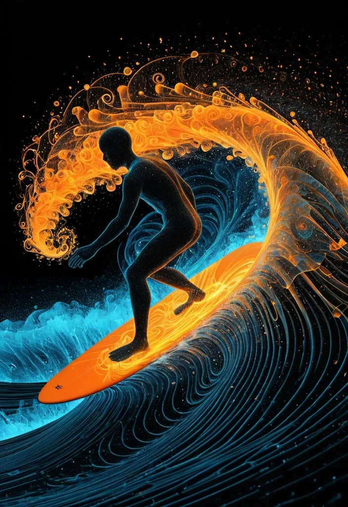 Minimalism Pointillism Graphic electronic drawing , From a swirl of water waves emerges a transparent , smoky outline of a lonely a person who rides waves on a orange surfboard , motion to down made of water splashing , on wavy ocean black background , black on black , inversion of water drops , murmuration , fractal , neon amber motion , carving through streaking blue light vortex trails. Style: deeply spiritual sci-fi art , reminiscent of digital hyperrealism combined with cosmic impressionism. Focus on intricate detail of light and energetic flow. ,