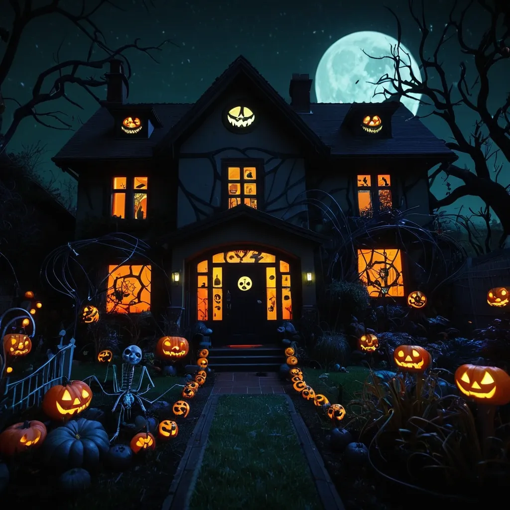 Generate a Halloween themed picture of a nighttime garden and a house. Process the music video from Jamie Woon - Night Air for image inspiration. Include eerily glowing night plants and animals (for example , insects , bugs , snails). The house has Halloween decorations on the walls , windows , and the front door. Include Jack O' Lanterns , spiderwebs , and glow-in-the-dark objects. ,