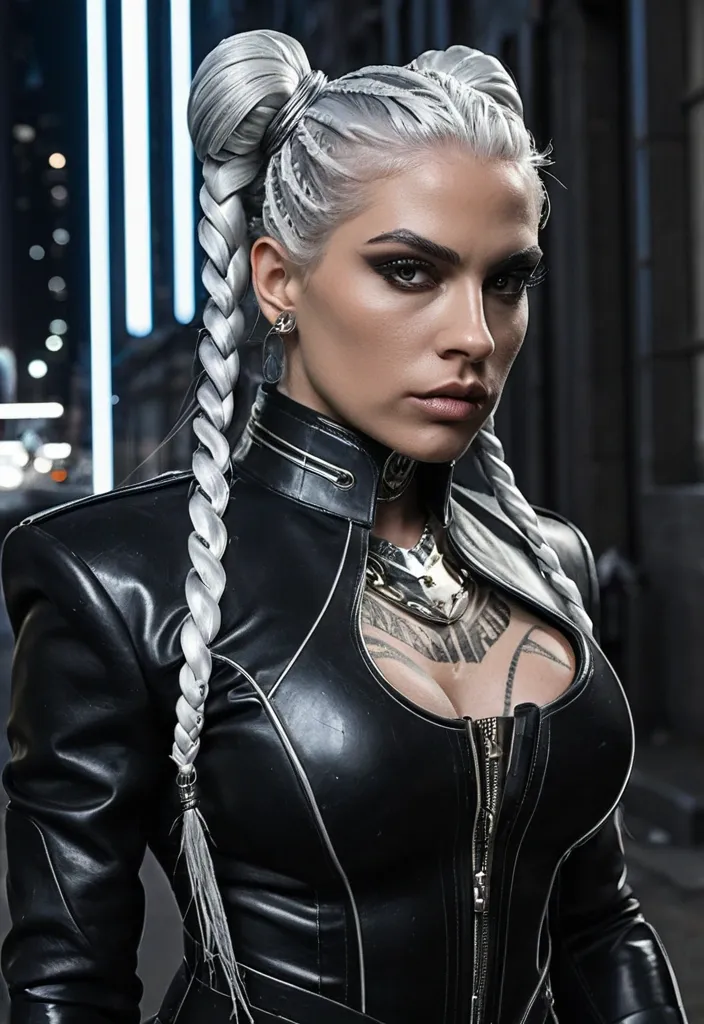 Marquela Araceli’s hair is sculpted into two long , platinum braids that fall from twin buns , each strand gleaming under the noir city lights like woven metal. The style perfectly balances precision and rebellion—an elegant yet dangerous symmetry that speaks to her discipline as Behemoth’s manager. Her platinum tone catches every flicker of neon from Dream City’s skyline , reflecting authority wrapped in artistry. Her eyes are a piercing blue-gray , sharp as glass yet deep enough to hide motives and secrets. They’re framed by sleek , defined brows and a touch of dark eyeliner that amplifies her commanding expression. Her face is chiseled and striking , every contour sculpted with purpose—from the smooth high cheekbones to the confident , unflinching jawline. She wears her beauty like armor—cool , deliberate , and untouchable. Her body exudes controlled strength—muscular and athletic but undeniably feminine. The fitted black leather jacket molds to her physique , emphasizing her power while maintaining Dream City’s signature 1940s-futuristic aesthetic. Tattoos sweep elegantly across her neck and chest like dark silk etchings of history and defiance , offset by the metallic glint of gold hoops and a bead necklace. Marquela looks like she could command a boardroom , a battlefield , or a back alley—whichever the night demands. ,
