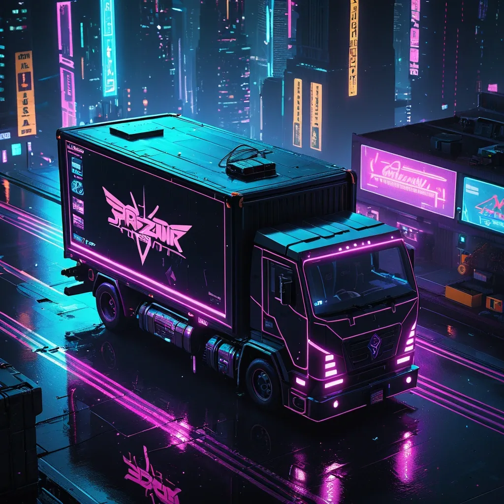 A detailed cyberpunk truck with a box van (like a delivery or furniture truck , not a massive semi-truck) , styled like Cyberpunk 2077 game art , featuring neon lights , futuristic mods , chrome details , and glowing holographic accents. Isometric top-down angled view , as if in a real-time strategy game , driving on a well-lit urban highway at night , with wet streets reflecting neon , towering skyscrapers with vibrant signs , flying drones , and a distant city glow. High contrast lighting , volumetric fog , immersive cyberpunk vibe , ultra-realistic , 8k resolution , cinematic composition ,