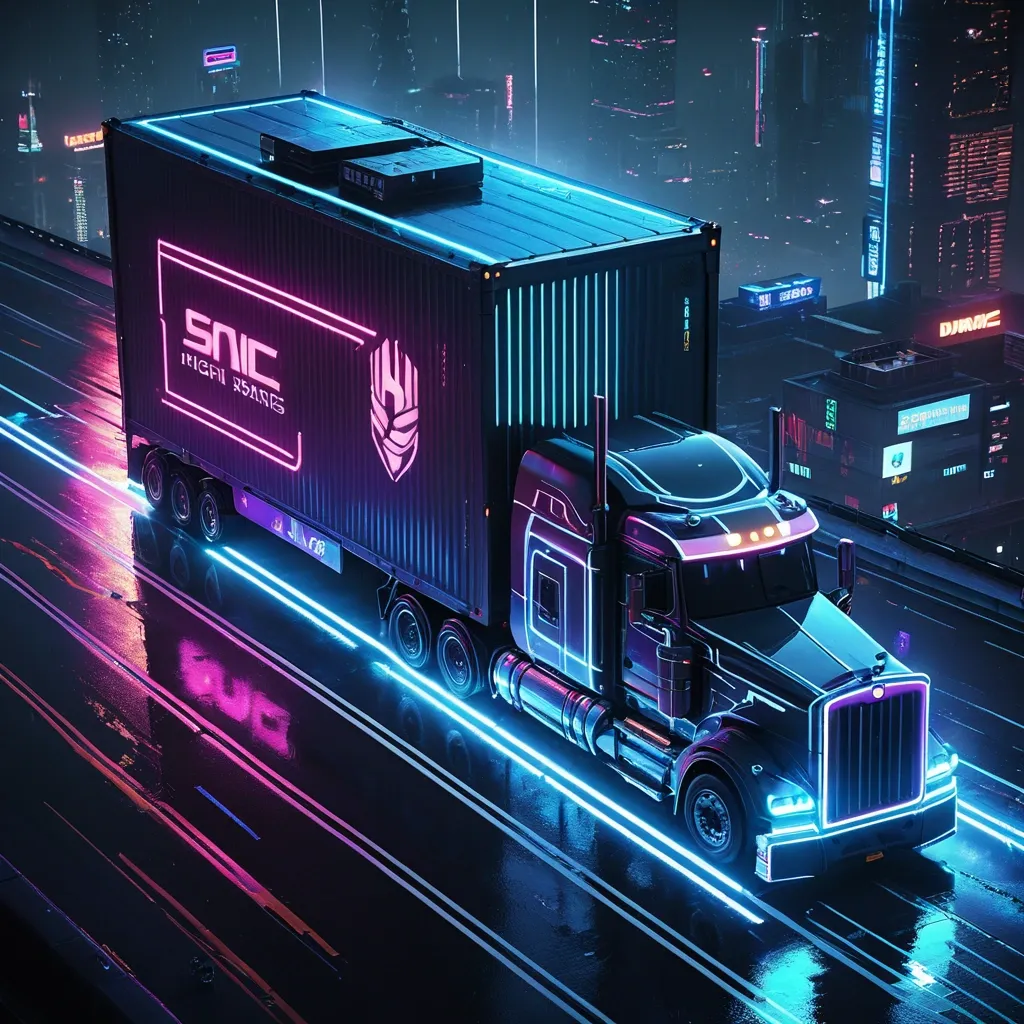 A detailed truck with a semi-trailer and a 40-foot-tall HRS station container (resembling a giant semi-trailer) , styled to resemble a shipping container , features neon lighting , futuristic modifications , chrome details , and glowing holographic accents. A top-down isometric view , reminiscent of a real-time strategy game , features driving along a well-lit city highway at night , with wet streets reflecting neon lights , towering skyscrapers with bright signs , flying drones , and the distant glow of the city. High-contrast lighting , volumetric fog , a captivating cyberpunk atmosphere , ultra-realistic visuals , 8K resolution , and a cinematic composition. ,