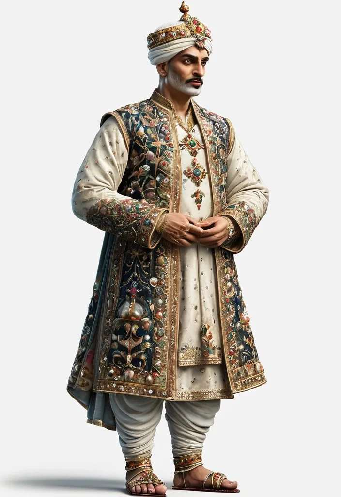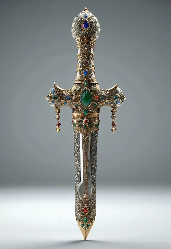 Jeweled Dagger of Jahangir , luxurious personal weapon reflecting the emperor’s refined taste and craftsmanship , hilt adorned with gemstones and intricate metalwork , Style: Matte Painting , detailed and atmospheric with subtle depth of field , White or Transparent Background , Full view , Side View , 4K. ,