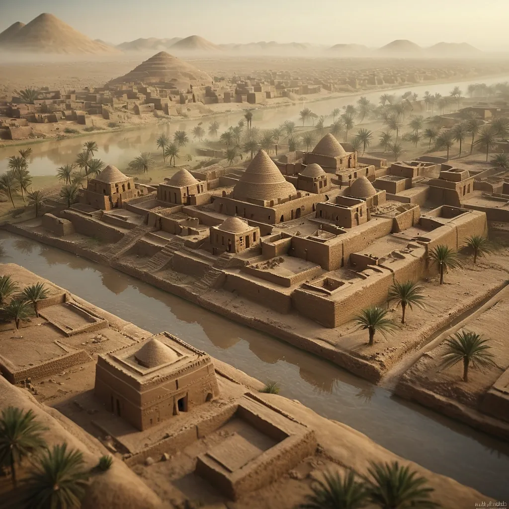 Eridu in 3000 BCE , a bustling Sumerian settlement by the Euphrates , mud-brick houses , stepped ziggurat rising in the center , palm groves along the riverbanks , early morning mist , Style: hyperrealistic with a painterly texture , reminiscent of historical reconstruction art , detailed and atmospheric with subtle depth of field , Wide view , Side View , 4K. ,