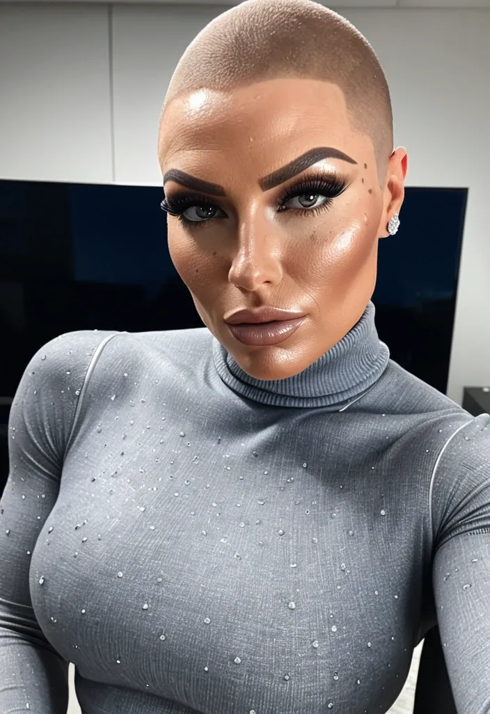 Generate Gorgeous female boss , bimbo , hourglass body , abnormally massive female bodybuilder , gorgeous , close up , full lips , big booty , brown , freckles on face and breast , Her hairstyle is a very short , close-cropped buzz cut that keeps everything sleek , clean , and sharp. It emphasizes her facial structure and bold features while keeping the look modern and powerful. feminine silhouette , too big breast , big booty , sexy thighs abs , silhouette , up close , flexing biceps , big oval beautiful strikingly icy green eyes , legs are iconic and defining physical feature , both visually and in terms of combat ability.wearing an outfit that is a striking blend of elegance , power , and femininity , designed to command attention in any room. The suit is tailored to perfection , hugging the wearer’s curves with precision while emphasizing a structured silhouette. The fabric itself is a refined grey tweed patterned with subtle white grid lines , giving the suit a texture that feels both sophisticated and modern. The blazer features broad blue lapels and gold button accents , adding a luxurious touch that elevates the look beyond typical business attire. The matching high-waisted trousers elongate the frame , further enhancing the poised and commanding effect of the ensemble.The styling choices amplify the boldness of the suit. The inner blouse is a silky , greybutton-down shirt that complements the tweed’s tone while introducing a softer , feminine balance to the sharp tailoring of the jacket. The blouse peeks out neatly from under the blazer , maintaining elegance without drawing focus away from the suit’s commanding cut. Accessories are kept minimal yet intentional: a delicate layered gold necklace and hoop earrings that add glimmers of light and luxury without overpowering the outfit. The choice of voluminous , honey-brown braids cascading down her shoulders frames the face with both confidence and glamour , completing the commanding visual.Altogether , this look communicates a blend of authority and allure. It is business-ready yet fashion-forward , balancing corporate structure with vibrant femininity. The color palette blue , grey and gold avoids being overly delicate , instead embracing the richness of texture , structure , and presence. This is the kind of ensemble that speaks to ambition , sophistication , and personal style—ideal for someone who thrives in positions of influence but insists on expressing her individuality with bold elegance. It’s not just clothing—it’s a statement of power wrapped in grace. In luxury living legs that could crush a watermelon , skirt high boots are a bold and striking statement piece , crafted in glossy black patent leather that gives them a sleek , polished finish. Rising to just below the knee , the boots feature three adjustable buckle straps along the shaft , adding both edge and detail to their design. The towering stiletto heel , paired with a thick platform sole , creates an ultra-dramatic silhouette that elongates the leg and exudes power and confidence. With their combination of shine , height , and structure , these boots perfectly balance fierce femininity with high-fashion allure. Teal and pink , swede and leather t-shirt , enormous breast , enormous butt , modest top , closed top collar , zipped up top , Her outfit is loud , powerful , and bright — the kind of style that takes over a room the second she walks in. The top portion combines glossy black with bold yellow , forming a futuristic , body-contoured suit that looks engineered more than simply sewn. The high shine material reflects light like a lacquered automotive finish — clean , smooth , and aggressively high fashion. It gives the impression of authority , confidence , and full control.The skirt continues that same energy — a sleek , high-waisted bright yellow pencil style that molds to her shape like a sculptor’s signature piece. The belt , solid black with metallic hardware , breaks the yellow just enough to sharpen the silhouette and emphasize her waist. The entire look feels intentionally aerodynamic — almost superhero executive couture — the type of uniform someone elite in a powerful syndicate or futuristic megacorp would wear as standard.Her long straight hair with bangs , paired with hoop earrings and sharp red nails , completes the aesthetic with a modern feminine edge. It’s a blend of dominance , elegance , and danger — like she’s the CEO of a high-security tech empire who can crush a corporate takeover before breakfast , and look immaculate doing it. This outfit isn’t just fashion — it’s a message. Grey , ivory , and sparkly navy blue stylish turtleneck and sliver diamond and sapphire necklace.freckles full body shot ,