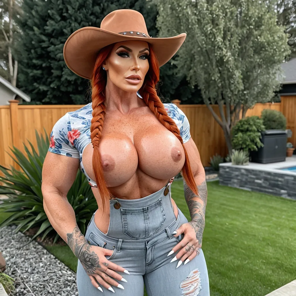 Generate Gorgeous female boss , bimbo , hourglass body , abnormally massive female bodybuilder , gorgeous , close up , full lips , big booty , redheaded , freckles on face and breast , braided design hair , feminine silhouette , too big breast , big booty , sexy thighs abs , silhouette , up close , flexing biceps , beautiful green eyes , legs are iconic and defining physical feature , both visually and in terms of combat ability.wearing an outfit that is a striking blend of elegance , power , and femininity , designed to command attention in any room. The suit is tailored to perfection , hugging the wearer’s curves with precision while emphasizing a structured silhouette. The fabric itself is a refined grey tweed patterned with subtle white grid lines , giving the suit a texture that feels both sophisticated and modern. The blazer features broad blue lapels and gold button accents , adding a luxurious touch that elevates the look beyond typical business attire. The matching high-waisted trousers elongate the frame , further enhancing the poised and commanding effect of the ensemble.The styling choices amplify the boldness of the suit. The inner blouse is a silky , greybutton-down shirt that complements the tweed’s tone while introducing a softer , feminine balance to the sharp tailoring of the jacket. The blouse peeks out neatly from under the blazer , maintaining elegance without drawing focus away from the suit’s commanding cut. Accessories are kept minimal yet intentional: a delicate layered gold necklace and hoop earrings that add glimmers of light and luxury without overpowering the outfit. The choice of voluminous , honey-brown braids cascading down her shoulders frames the face with both confidence and glamour , completing the commanding visual.Altogether , this look communicates a blend of authority and allure. It is business-ready yet fashion-forward , balancing corporate structure with vibrant femininity. The color palette blue , grey and gold avoids being overly delicate , instead embracing the richness of texture , structure , and presence. This is the kind of ensemble that speaks to ambition , sophistication , and personal style—ideal for someone who thrives in positions of influence but insists on expressing her individuality with bold elegance. It’s not just clothing—it’s a statement of power wrapped in grace. In luxury living legs that could crush a watermelon , skirt high boots are a bold and striking statement piece , crafted in glossy black patent leather that gives them a sleek , polished finish. Rising to just below the knee , the boots feature three adjustable buckle straps along the shaft , adding both edge and detail to their design. The towering stiletto heel , paired with a thick platform sole , creates an ultra-dramatic silhouette that elongates the leg and exudes power and confidence. With their combination of shine , height , and structure , these boots perfectly balance fierce femininity with high-fashion allure. Massive breast , western hat , massive cleavage , standing in backyard wearing a white , blue and gray floral t-shirt , gray denim pants , enormous butt denim overalls ,
