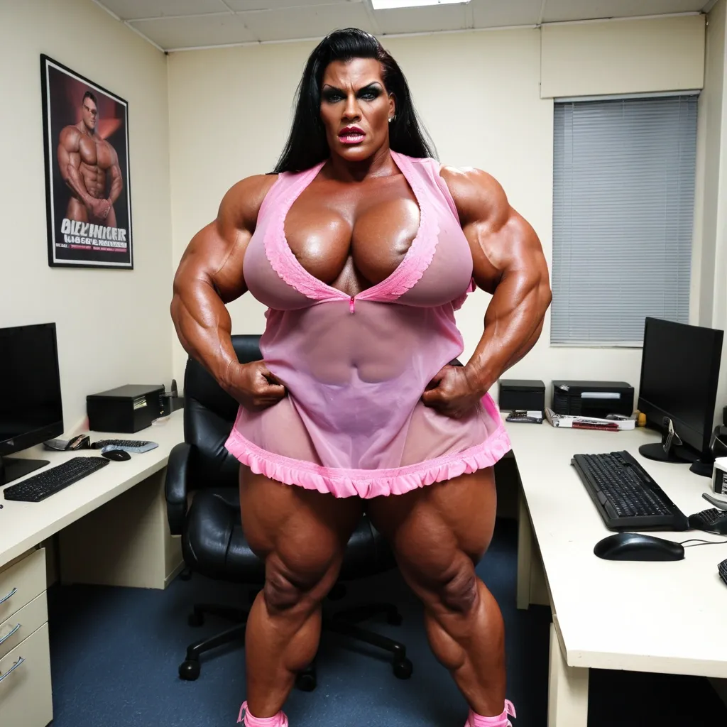 À giant muscular chubby most busty femalebodybuilder , housewife woman BBW musclée , heavy weight bodybuildeuse géante et plantureuse with giant chest , imposante dame massive , beautiful make up Grace Jones face , in a police station office , avec de gros seins , énormes biceps musclés , in pink laces transparent very short mini loose nightgown with heels , exposant les seins , bras musclés exposés , dominante , jambes massives exposées , agressive , ,