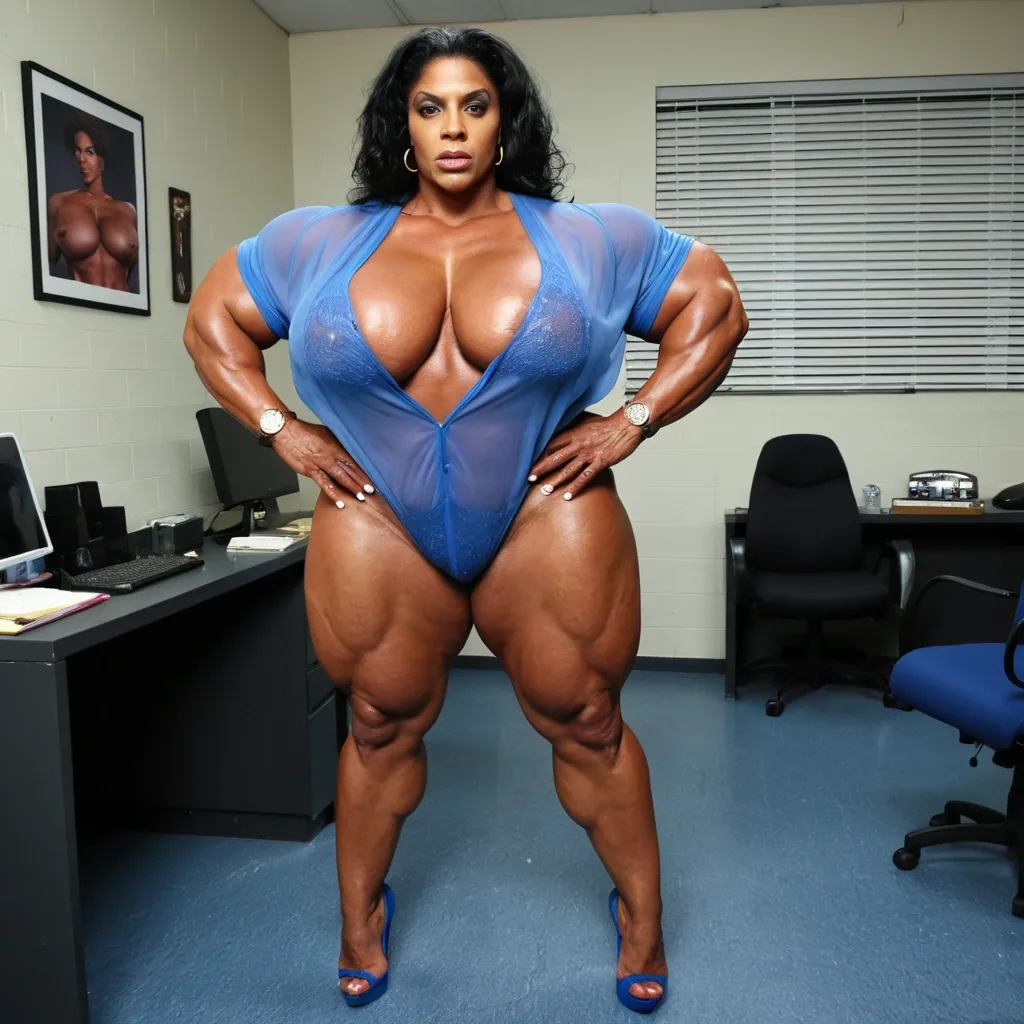 À giant muscular chubby most busty femalebodybuilder , housewife woman BBW musclée , heavy weight bodybuildeuse géante et plantureuse with giant chest , imposante dame massive , beautiful make up Vanessa Williams face , in a police station office , avec de gros seins , énormes biceps musclés , in blue laces transparent very short mini loose nightgown with heels , exposant les seins , bras musclés exposés , dominante , jambes massives exposées , agressive , ,