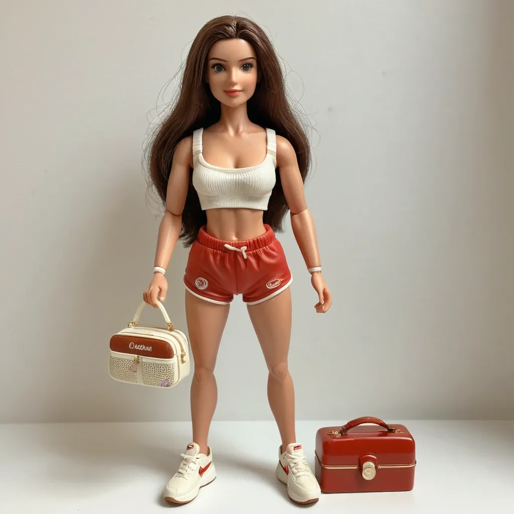 Whole body of a beautiful woman action figure. 9:16 ratio. Woman , slim , beautiful , large eyes , brown eyes , Whole body , mid-wide face , big nose , thick lips , hair , chestnut , seeds , , hair largo , staring straight into the camera , with tight red sports shorts , white bra top , , white tennis shoes , de Whole body , standing , with hands on waist , happy soft smile.She is a premium collectible toy style. The woman doll should be standing and face forward. The package should have a header with the phrase 'Olivian' in large print. The accessories in the next compartment to the figure are a cream knit bra top , a vintage handbag , and a luxurious mobile phone. ,