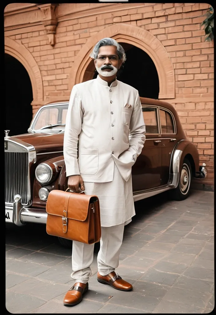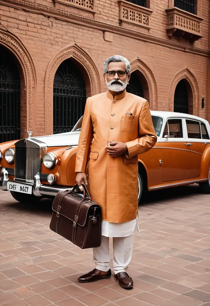 A retro-style photo of an elegant mature man (Use the uploaded image as the sole and 100% exact only face) , long curly white mustache , likeness of the mature Indian man on the street. He is standing next to his classic rolls royce car with a leather interior design , holding a laptop-bag , dressed in a traditional light-orange kurta , white dhoti , dark brown leather Jutti and accessorized with delicate framed glasses (same or very similar styling to input image). The setting includes a brick wall background , capturing a nostalgic atmosphere reminiscent of old Hollywood glamour. His gray-white hair has natural waves that add character to the scene. Shot on Kodak film using analog cameras for authentic textures and color grading , in the style of old Hollywood --ar 9:16 --v 8 ,
