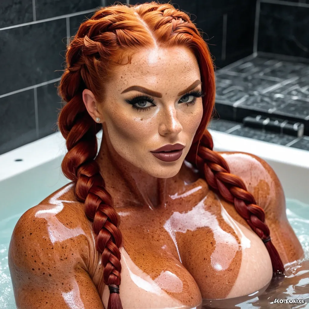 Generate Gorgeous female boss , bimbo , hourglass body , abnormally massive female bodybuilder , gorgeous , close up , full lips , big booty , redheaded , freckles on face and breast , braided design hair , feminine silhouette , too big breast , big booty , sexy thighs abs , silhouette , up close , flexing biceps , beautiful green eyes , legs are iconic and defining physical feature , both visually and in terms of combat ability.wearing an outfit that is a striking blend of elegance , power , and femininity , designed to command attention in any room. The suit is tailored to perfection , hugging the wearer’s curves with precision while emphasizing a structured silhouette. The fabric itself is a refined grey tweed patterned with subtle white grid lines , giving the suit a texture that feels both sophisticated and modern. The blazer features broad blue lapels and gold button accents , adding a luxurious touch that elevates the look beyond typical business attire. The matching high-waisted trousers elongate the frame , further enhancing the poised and commanding effect of the ensemble.The styling choices amplify the boldness of the suit. The inner blouse is a silky , greybutton-down shirt that complements the tweed’s tone while introducing a softer , feminine balance to the sharp tailoring of the jacket. The blouse peeks out neatly from under the blazer , maintaining elegance without drawing focus away from the suit’s commanding cut. Accessories are kept minimal yet intentional: a delicate layered gold necklace and hoop earrings that add glimmers of light and luxury without overpowering the outfit. The choice of voluminous , honey-brown braids cascading down her shoulders frames the face with both confidence and glamour , completing the commanding visual.Altogether , this look communicates a blend of authority and allure. It is business-ready yet fashion-forward , balancing corporate structure with vibrant femininity. The color palette blue , grey and gold avoids being overly delicate , instead embracing the richness of texture , structure , and presence. This is the kind of ensemble that speaks to ambition , sophistication , and personal style—ideal for someone who thrives in positions of influence but insists on expressing her individuality with bold elegance. It’s not just clothing—it’s a statement of power wrapped in grace. In luxury living legs that could crush a watermelon , skirt high boots are a bold and striking statement piece , crafted in glossy black patent leather that gives them a sleek , polished finish. Rising to just below the knee , the boots feature three adjustable buckle straps along the shaft , adding both edge and detail to their design. The towering stiletto heel , paired with a thick platform sole , creates an ultra-dramatic silhouette that elongates the leg and exudes power and confidence. With their combination of shine , height , and structure , these boots perfectly balance fierce femininity with high-fashion allure. Sitting and relaxing hot tub , in jacuzzi ,