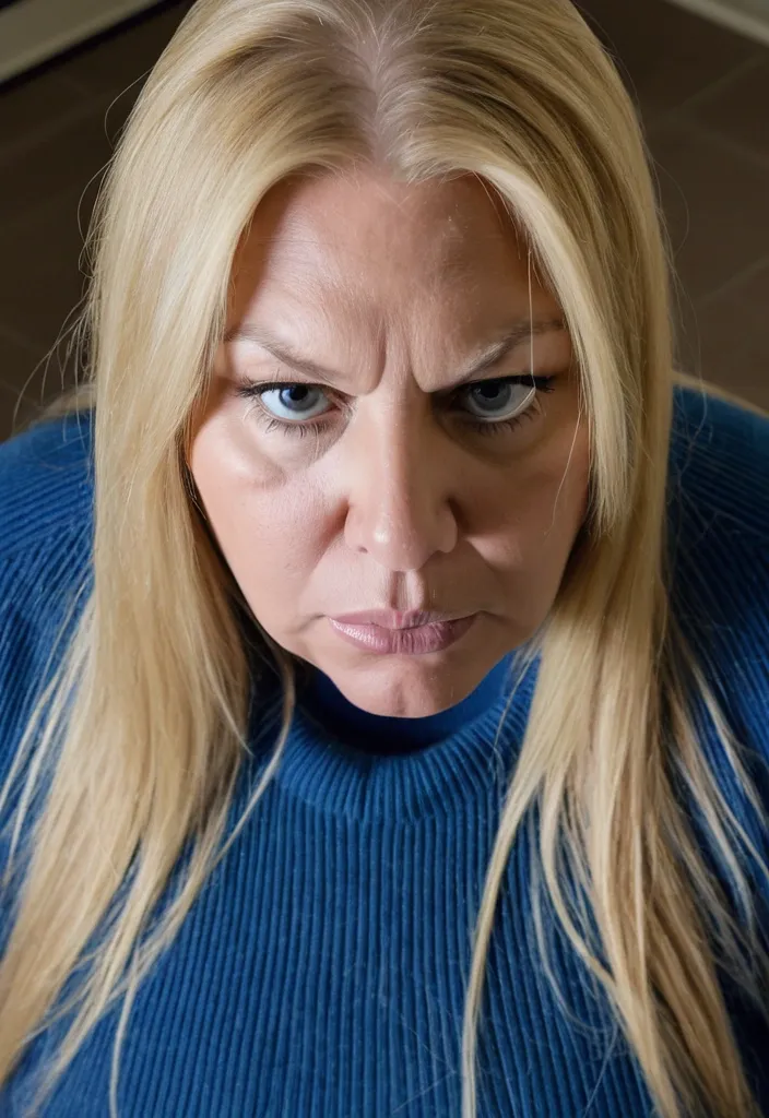 À giant muscular chubby most busty femalebodybuilder , housewife woman BBW musclée , heavy weight bodybuildeuse géante et plantureuse with giant chest , imposante dame massive , beautiful make up Christina Aguilera face , in a police station office , avec de gros seins , énormes biceps musclés , in violet laces transparent very short mini loose nightgown with heels , exposant les seins , bras musclés exposés , dominante , jambes massives exposées , agressive , ,