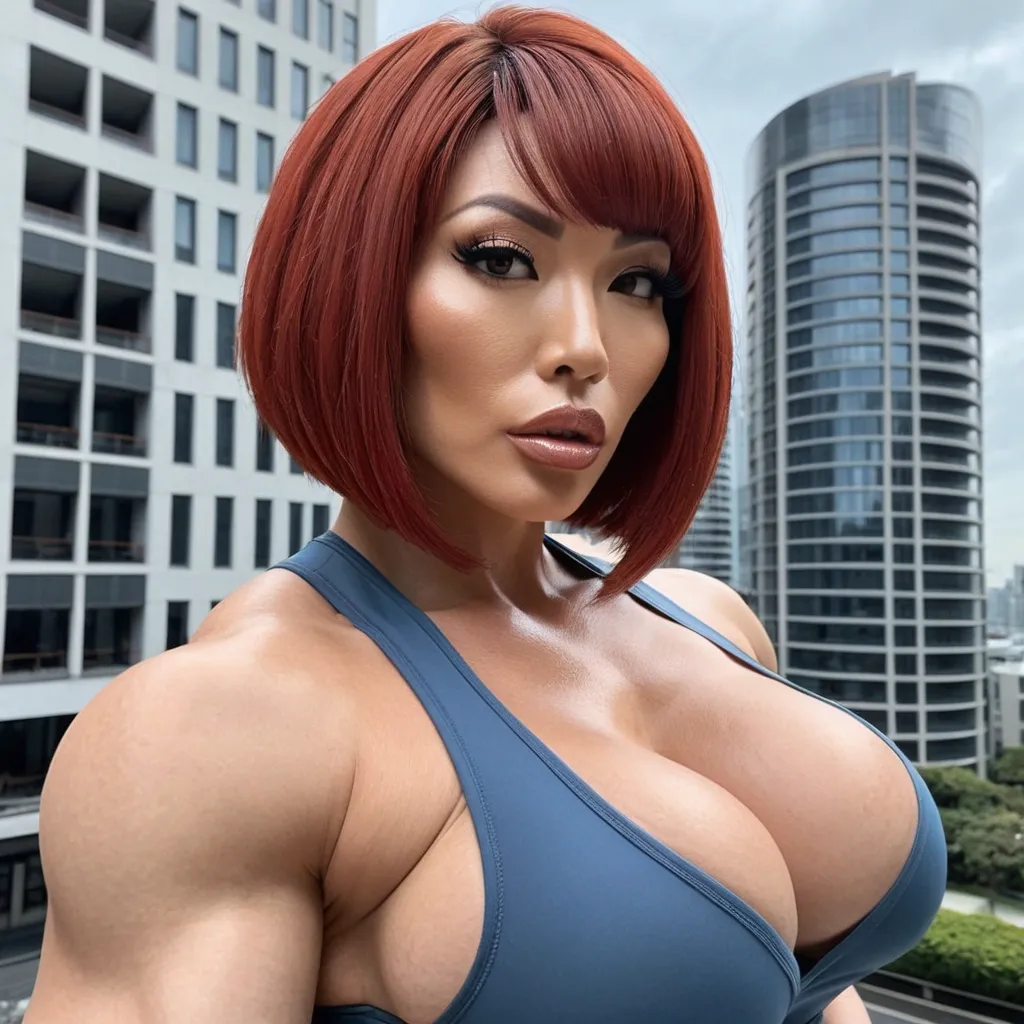 Generate Gorgeous female boss , bimbo , hourglass body , Japanese woman , abnormally massive female bodybuilder , gorgeous , close up , full lips , big booty , red hair , short bob-cut hair , , feminine silhouette , too big breast , big booty , sexy thighs abs , silhouette , up close , flexing biceps , beautiful brown eyes , legs are iconic and defining physical feature , both visually and in terms of combat ability.wearing an outfit that is a striking blend of elegance , power , and femininity , designed to command attention in any room. Outfit tailored to perfection , hugging the wearer’s curves with precision while emphasizing a structured silhouette. The fabric texture that feels both sophisticated and modern. The tank top features a luxurious touch that elevates the look beyond typical attire. The matching high-waisted shorts elongate the frame , further enhancing the poised and commanding effect of the ensemble.The styling choices amplify the boldness of the outfit. The outfit complements the tweed’s tone while introducing a softer , feminine balance to the sharp tailoring of the outfit. She is maintaining elegance without drawing focus away from the outfit commanding cut. Accessories are kept minimal yet intentional: a delicate layered gold necklace and hoop earrings that add glimmers of light and luxury without overpowering the outfit. The choice of voluminous , short bob-cut hair cascading down to her shoulders frames the face with both confidence and glamour , completing the commanding visual.Altogether , this look communicates a blend of authority and allure. It is fashion-forward , balancing corporate structure with vibrant femininity. The color palette blue tank top and grey short avoids being overly delicate , instead embracing the richness of texture , structure , and presence. This is the kind of ensemble that speaks to ambition , sophistication , and personal style—ideal for someone who thrives in positions of influence but insists on expressing her individuality with bold elegance. It’s not just clothing—it’s a statement of power wrapped in grace. In luxury living legs that could crush a cement block , she has a bold and striking statement piece , her big lips heart shaped lips in glossy red that gives them a sleek , polished finish. Adding both edge and detail to their design. The towering stiletto heel , paired with a thick platform sole , creates an ultra-dramatic silhouette that elongates the leg and exudes power and confidence. With their combination of shine , height , and structure , these boots perfectly balance fierce femininity with high-fashion allure. High cheekbones , prominent jawline , gorgeous big brown eyes , enormous breast , blue tank top , high rise grey short , enormous butt ,