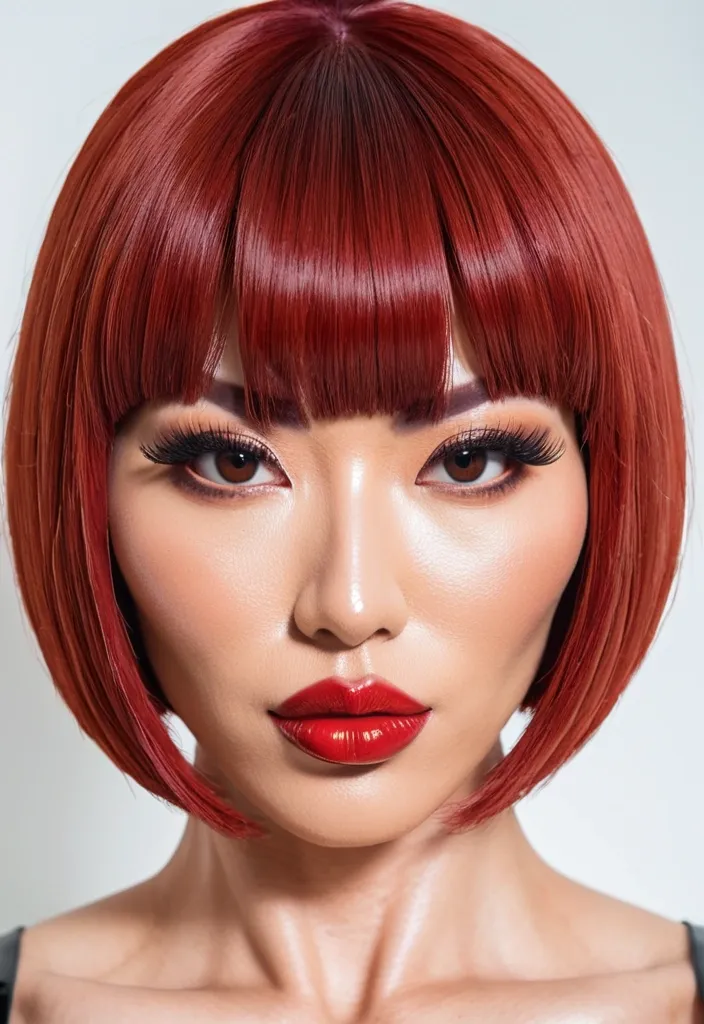 Generate Gorgeous female boss , 34 years old , Japanese woman , pointy face , bimbo , hourglass body , abnormally massive female bodybuilder , gorgeous , close up , full lips , big booty , red hair breast , short bob-cut , bangs cover forhead design hair , feminine silhouette , too big breast , big booty , sexy thighs abs , silhouette , up close , flexing biceps , beautiful green eyes , legs are iconic and defining physical feature , both visually and in terms of combat ability.wearing an outfit that is a striking blend of elegance , power , and femininity , designed to command attention in any room. The suit is tailored to perfection , hugging the wearer’s curves with precision while emphasizing a structured silhouette. The fabric itself is a refined grey tweed patterned with subtle white grid lines , giving the suit a texture that feels both sophisticated and modern. The blazer features broad blue lapels and gold button accents , adding a luxurious touch that elevates the look beyond typical business attire. The matching high-waisted trousers elongate the frame , further enhancing the poised and commanding effect of the ensemble.The styling choices amplify the boldness of the suit. The inner blouse is a silky , greybutton-down shirt that complements the tweed’s tone while introducing a softer , feminine balance to the sharp tailoring of the jacket. The blouse peeks out neatly from under the blazer , maintaining elegance without drawing focus away from the suit’s commanding cut. Accessories are kept minimal yet intentional: a delicate layered gold necklace and hoop earrings that add glimmers of light and luxury without overpowering the outfit. The choice oframes the face with both confidence and glamour , completing the commanding visual.Altogether , this look communicates a blend of authority and allure. It is business-ready yet fashion-forward , balancing corporate structure with vibrant femininity. The color palette blue , grey and gold avoids being overly delicate , instead embracing the richness of texture , structure , and presence. This is the kind of ensemble that speaks to ambition , sophistication , and personal style—ideal for someone who thrives in positions of influence but insists on expressing her individuality with bold elegance. It’s not just clothing—it’s a statement of power wrapped in grace. In luxury living legs that could crush a watermelon , skirt high boots are a bold and striking statement piece , crafted in glossy black patent leather that gives them a sleek , polished finish. Rising to just below the knee , the boots feature three adjustable buckle straps along the shaft , adding both edge and detail to their design. The towering stiletto heel , paired with a thick platform sole , creates an ultra-dramatic silhouette that elongates the leg and exudes power and confidence. With their combination of shine , height , and structure , these boots perfectly balance fierce femininity with high-fashion allure. Gorgeous brown eyes , big lips glossy lips , enormous breast , enormous butt , up close face portrait ,