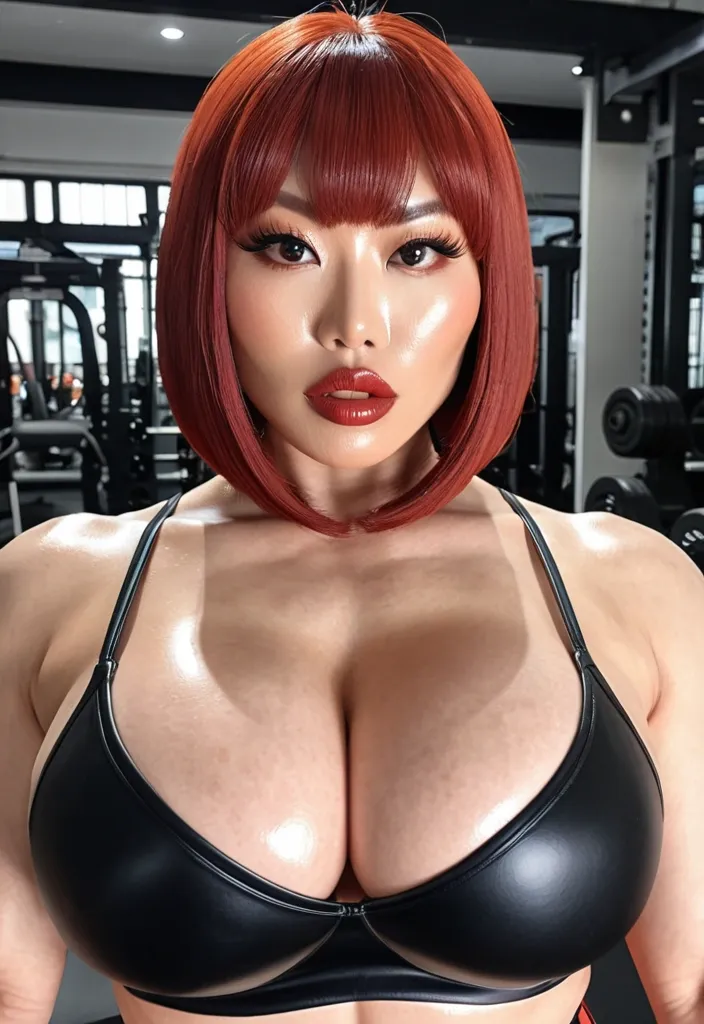 Generate Gorgeous female boss , 34 years old , Japanese woman , pointy face , bimbo , hourglass body , abnormally massive female bodybuilder , gorgeous , close up , full lips , big booty , red hair breast , short bob-cut , bangs cover forhead design hair , feminine silhouette , too big breast , big booty , sexy thighs abs , silhouette , up close , flexing biceps , beautiful green eyes , legs are iconic and defining physical feature , both visually and in terms of combat ability.wearing an outfit that is a striking blend of elegance , power , and femininity , designed to command attention in any room. The suit is tailored to perfection , hugging the wearer’s curves with precision while emphasizing a structured silhouette. The fabric itself is a refined grey tweed patterned with subtle white grid lines , giving the suit a texture that feels both sophisticated and modern. The blazer features broad blue lapels and gold button accents , adding a luxurious touch that elevates the look beyond typical business attire. The matching high-waisted trousers elongate the frame , further enhancing the poised and commanding effect of the ensemble.The styling choices amplify the boldness of the suit. The inner blouse is a silky , greybutton-down shirt that complements the tweed’s tone while introducing a softer , feminine balance to the sharp tailoring of the jacket. The blouse peeks out neatly from under the blazer , maintaining elegance without drawing focus away from the suit’s commanding cut. Accessories are kept minimal yet intentional: a delicate layered gold necklace and hoop earrings that add glimmers of light and luxury without overpowering the outfit. The choice oframes the face with both confidence and glamour , completing the commanding visual.Altogether , this look communicates a blend of authority and allure. It is business-ready yet fashion-forward , balancing corporate structure with vibrant femininity. The color palette blue , grey and gold avoids being overly delicate , instead embracing the richness of texture , structure , and presence. This is the kind of ensemble that speaks to ambition , sophistication , and personal style—ideal for someone who thrives in positions of influence but insists on expressing her individuality with bold elegance. It’s not just clothing—it’s a statement of power wrapped in grace. In luxury living legs that could crush a watermelon , skirt high boots are a bold and striking statement piece , crafted in glossy black patent leather that gives them a sleek , polished finish. Rising to just below the knee , the boots feature three adjustable buckle straps along the shaft , adding both edge and detail to their design. The towering stiletto heel , paired with a thick platform sole , creates an ultra-dramatic silhouette that elongates the leg and exudes power and confidence. With their combination of shine , height , and structure , these boots perfectly balance fierce femininity with high-fashion allure. Gorgeous brown eyes , big lips glossy lips , enormous breast , enormous butt , black spaghetti strap sports bra ,