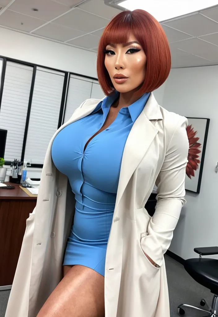 Generate Gorgeous female boss , bimbo , hourglass body , Japanese woman , abnormally massive female bodybuilder , gorgeous , close up , full lips , big booty , red hair , short bob-cut hair , , feminine silhouette , too big breast , big booty , sexy thighs abs , silhouette , up close , flexing biceps , beautiful brown eyes , legs are iconic and defining physical feature , both visually and in terms of combat ability.wearing an outfit that is a striking blend of elegance , power , and femininity , designed to command attention in any room. Outfit tailored to perfection , hugging the wearer’s curves with precision while emphasizing a structured silhouette. The fabric texture that feels both sophisticated and modern. The tank top features a luxurious touch that elevates the look beyond typical attire. The matching high-waisted shorts elongate the frame , further enhancing the poised and commanding effect of the ensemble.The styling choices amplify the boldness of the outfit. The outfit complements the tweed’s tone while introducing a softer , feminine balance to the sharp tailoring of the outfit. She is maintaining elegance without drawing focus away from the outfit commanding cut. Accessories are kept minimal yet intentional: a delicate layered gold necklace and hoop earrings that add glimmers of light and luxury without overpowering the outfit. The choice of voluminous , short bob-cut hair cascading down to her shoulders frames the face with both confidence and glamour , completing the commanding visual.Altogether , this look communicates a blend of authority and allure. It is fashion-forward , balancing corporate structure with vibrant femininity. The color palette blue tank top and grey short avoids being overly delicate , instead embracing the richness of texture , structure , and presence. This is the kind of ensemble that speaks to ambition , sophistication , and personal style—ideal for someone who thrives in positions of influence but insists on expressing her individuality with bold elegance. It’s not just clothing—it’s a statement of power wrapped in grace. In luxury living legs that could crush a cement block , she has a bold and striking statement piece , her big lips heart shaped lips in glossy red that gives them a sleek , polished finish. Adding both edge and detail to their design. The towering stiletto heel , paired with a thick platform sole , creates an ultra-dramatic silhouette that elongates the leg and exudes power and confidence. With their combination of shine , height , and structure , these boots perfectly balance fierce femininity with high-fashion allure. High cheekbones , prominent jawline , gorgeous big brown eyes , enormous breast , sky blue oxford shirt , brown dress pants , white long doctor’s coat. enormous butt , in doctor’s office ,